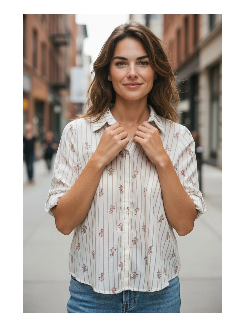 Blúzka pôsobí jemne, elegantne a veľmi žensky vďaka svojmu svetlému krémovému podkladu, ktorý je doplnený tenkými zvislými prúžkami v neutrálnom odtieni. Celkový vzhľad oživuje drobná kvetinová potlač v jemných ružových a zelených tónoch, ktorá je rovnomerne rozmiestnená po celej ploche a dodáva blúzke romantický nádych.Má klasický košeľový golier a zapínanie na gombíky po celej dĺžke, čo z nej robí nadčasový a ľahko kombinovateľný kúsok. Rukávy sú dlhé, no pôsobia ležérne vyhrnuté, čím podčiarkujú uvoľnený štýl. Strih je mierne voľný a pohodlný, s jemne zaobleným spodným lemom, takže blúzka pekne sedí na postave a je vhodná na každodenné nosenie aj neformálne príležitosti.