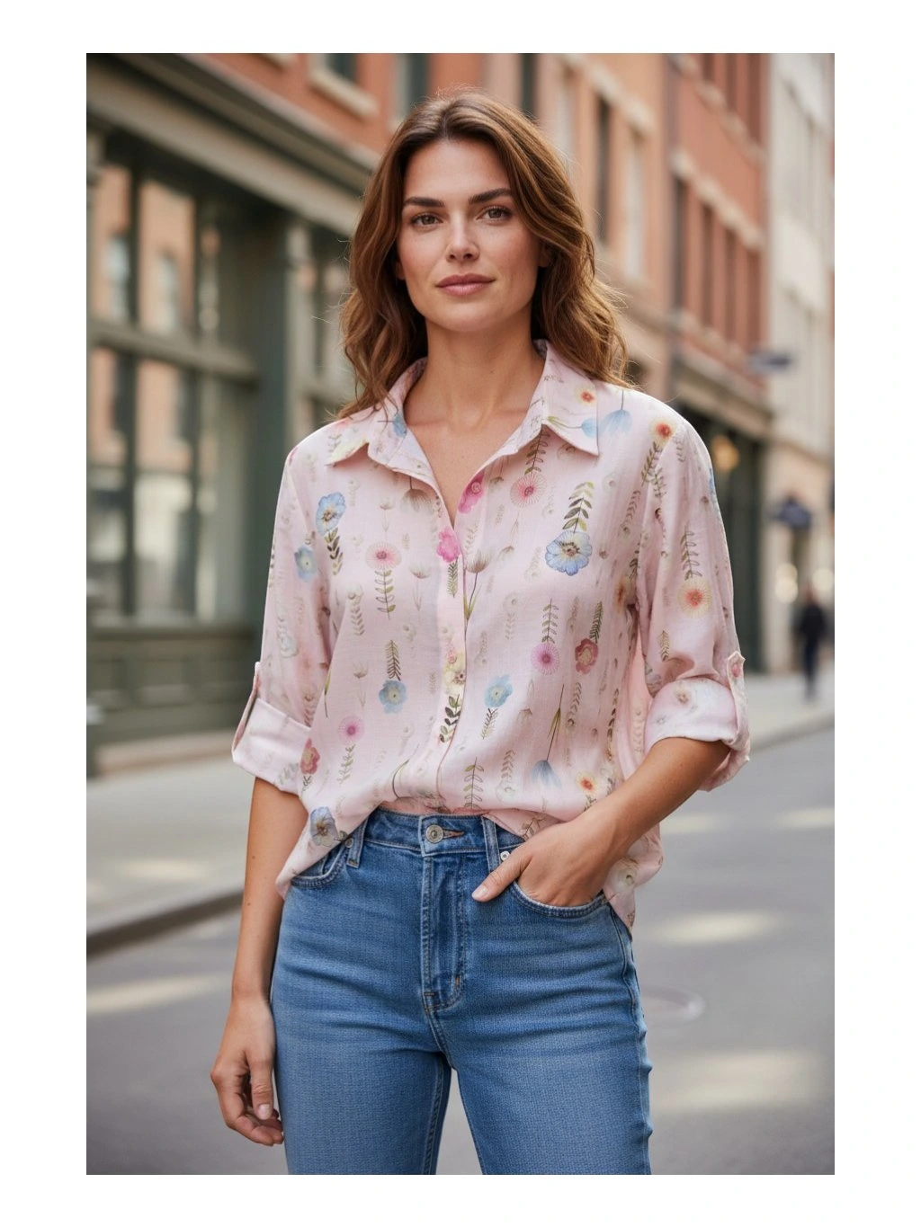 Blúzka pôsobí veľmi jemne, žensky a romanticky vďaka svojmu svetlému, púdrovo-ružovému odtieňu, ktorý je doplnený decentnou potlačou drobných kvetov a rastlinných motívov v pastelových farbách, ako sú modrá, žltá, ružová či zelená. Má klasický golier a zapínanie na gombíky po celej dĺžke, čo jej dodáva nadčasový a univerzálny vzhľad.Rukávy sú trojštvrťové a zakončené širšími manžetami, ktoré pridávajú blúzke elegantný detail. Strih je mierne voľný a pohodlný, s jemne zaobleným spodným lemom, vďaka čomu blúzka pekne splýva na postave. Materiál pôsobí ľahko a vzdušne, čo z nej robí ideálny kúsok na teplejšie dni alebo vrstvenie. Celkový dojem je svieži, prirodzený a veľmi nositeľný na každodenné aj neformálne príležitosti.