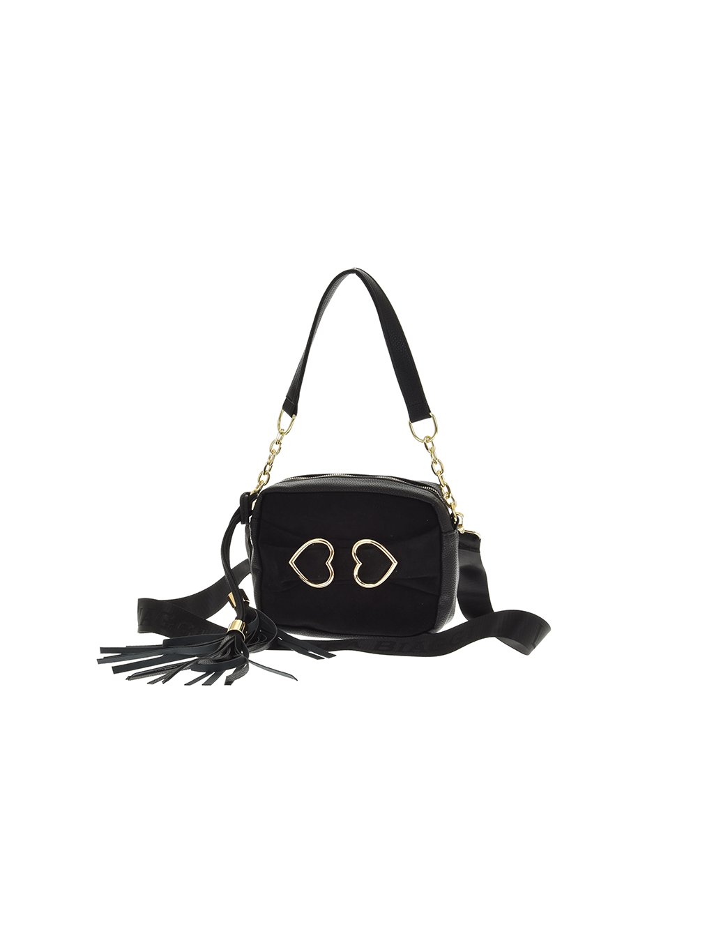 Laura Biaggi dámska crossbody kabelka v čiernej farbe. Má obdĺžnikový tvar a jej dizajn pôsobí moderne aj elegantne. Na prednej strane sú dva kovové ozdobné prvky v tvare srdca v zlatej farbe, čo pôsobí romanticky a štýlovo. Kabelka má kombinované remienky – jeden kratší s kovovými zlatými retiazkovými časťami a druhý dlhší popruh na nosenie cez plece alebo krížom. Na boku je tiež ozdobná strapcová prívesková dekorácia. Materiál je hladká eko koža.