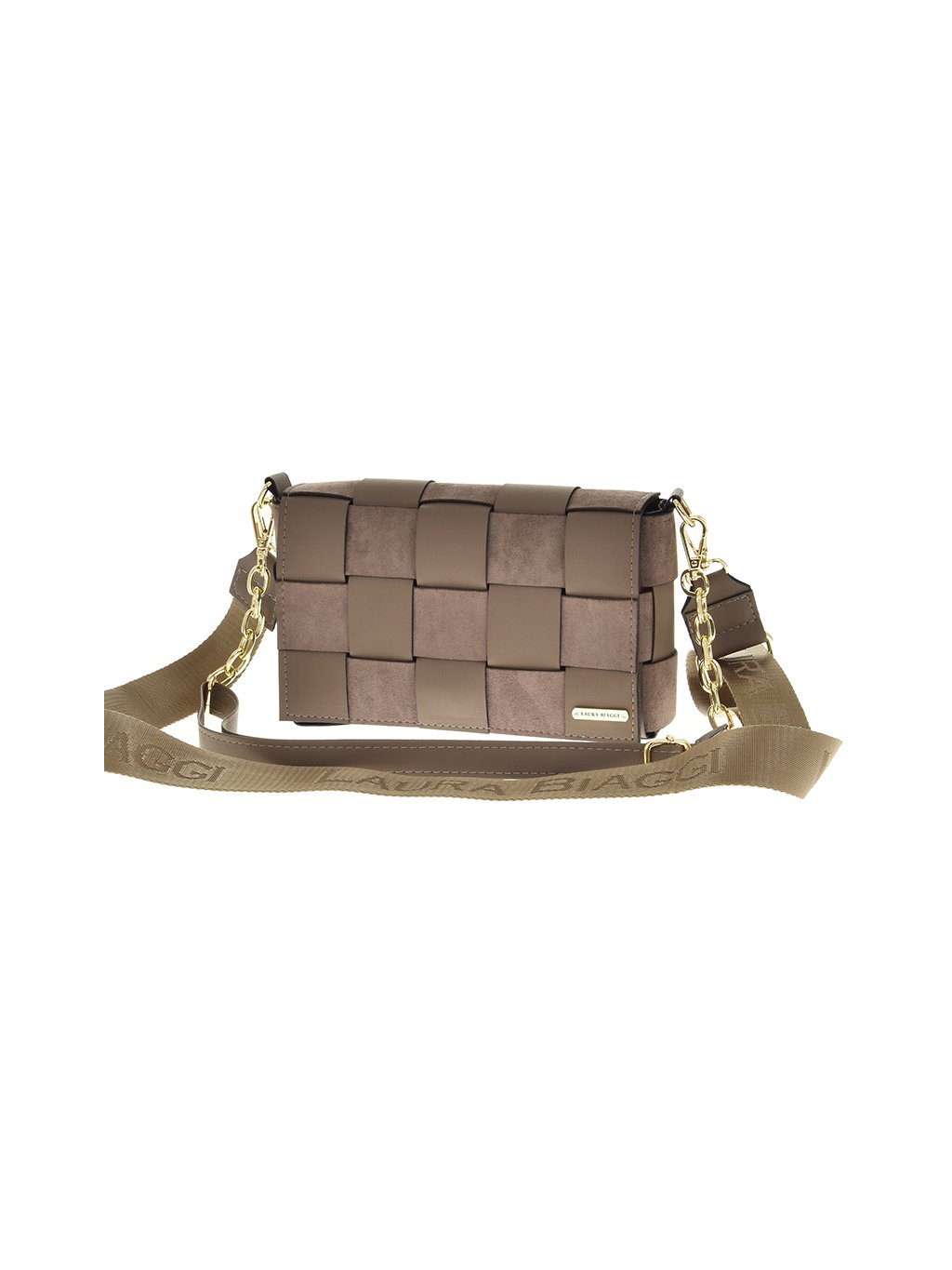 Táto štýlová kabelka zn. Laura Biaggi zo syntetického materiálu v sivo-hnedej farbe zaujme elegantným prepletaným dizajnom z hladkých a semišových pásikov. Má kompaktný obdĺžnikový tvar, ideálny na každodenné nosenie alebo spoločenské príležitosti. Kabelka je doplnená o výrazné kovové detaily v zlatej farbe a širší nastaviteľný popruh s logom, ktorý je možné odopnúť. Na prednej strane sa nachádza decentná kovová platnička s logom značky. Moderný a zároveň nadčasový doplnok, ktorý dodá outfitu elegantný šmrnc.