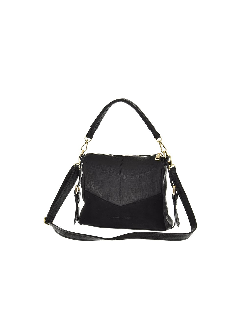 Elegantná dámska kabelka Laura Biaggi v čiernej farbe, vyrobená z kombinácie dvoch materiálov – vrchná časť je z jemne štruktúrovanej eko kože a spodná časť pripomína zamatový/zamatovo-matný semiš. Kabelka má dva typy popruhov: kratšie pevné ucho na nosenie v ruke a dlhý nastaviteľný popruh na rameno alebo cez telo (crossbody). Kovové prvky, ako karabíny, pracky a zips, sú v zlatej farbe, čo dodáva modelu luxusný vzhľad. Hlavný priestor sa zapína zipsom umiestneným na vrchu. V spodnej časti predného panelu je decentné logo Laura Biaggi.