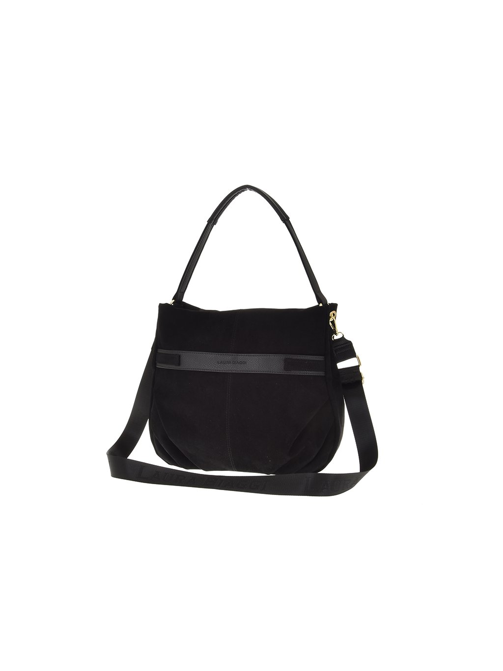 Elegantná dámska kabelka zo syntetického materiálu v čiernej farbe, ktorá kombinuje matný a semišový povrch pre sofistikovaný vzhľad. Má priestranný tvar vhodný na každodenné nosenie. Kabelka je vybavená dvoma popruhmi – kratším na nosenie v ruke alebo na pleci a dlhším, nastaviteľným popruhom s logom Laura Biaggi pre pohodlné nosenie krížom.
