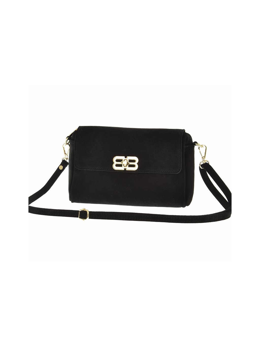 Táto kabelka z produkcie Laura Biaggi je veľmi elegantná, minimalistická a univerzálna. Je vyrobená z čierneho materiálu s matným, semišovým až brúseným vzhľadom, ktorý dodáva luxusný a nadčasový dojem. Má jednoduchý obdĺžnikový tvar a predná chlopňa sa uzatvára pomocou ozdobnej kovovej spony v zlatej farbe, ktorá vytvára dojem prepojených písmen alebo moderného loga.
