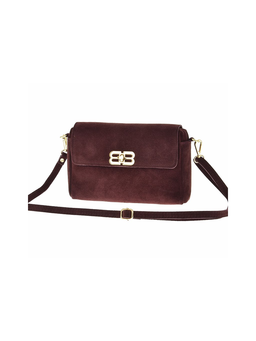 Táto kabelka z produkcie Laura Biaggi je veľmi elegantná, minimalistická a univerzálna. Je vyrobená v burgundskej farbe, prírodný kožený materiál s matným, semišovým až brúseným vzhľadom, ktorý dodáva luxusný a nadčasový dojem. Má jednoduchý obdĺžnikový tvar a predná chlopňa sa uzatvára pomocou ozdobnej kovovej spony v zlatej farbe, ktorá vytvára dojem prepojených písmen alebo moderného loga.