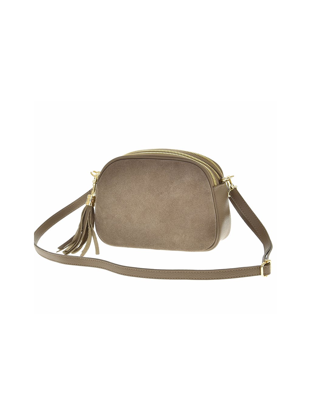 Táto kabelka má oválny tvar a je vyrobená v kombinácii hladkého a semišového materiálu v taupe /béžovo-sivej/ farbe. Má dlhý nastaviteľný popruh na nosenie cez plece a zdobená je strapcovým príveskom pri zipse. Zlaté kovové detaily jej dodávajú elegantný a moderný vzhľad. Má 3 zlaté zipsy na delenie vnútri.