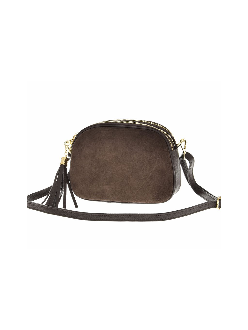 Táto kabelka má oválny tvar a je vyrobená v kombinácii hladkého a semišového materiálu v tmavohnedej farbe. Má dlhý nastaviteľný popruh na nosenie cez plece a zdobená je strapcovým príveskom pri zipse. Zlaté kovové detaily jej dodávajú elegantný a moderný vzhľad. Má 3 zlaté zipsy na delenie vnútri.