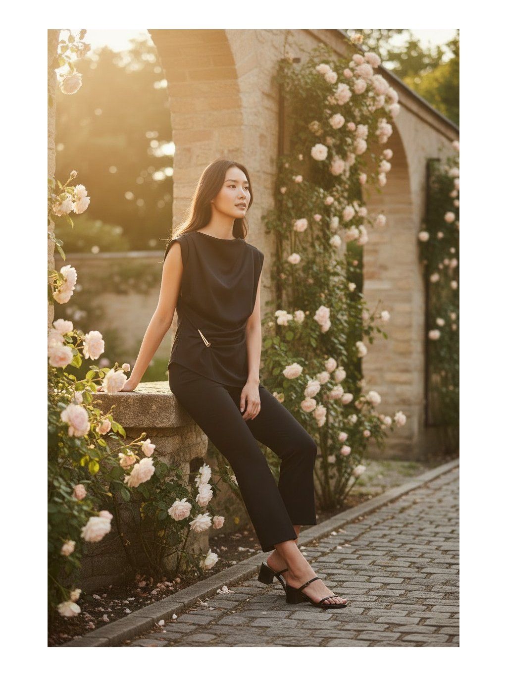Top s asymetrickým strihom a jemným riasením krásne zvýrazní postavu, zatiaľ čo skrátené nohavice s čistými líniami opticky predĺžia siluetu. Ľahký a príjemný materiál zaručuje pohodlie počas celého dňa aj večera.