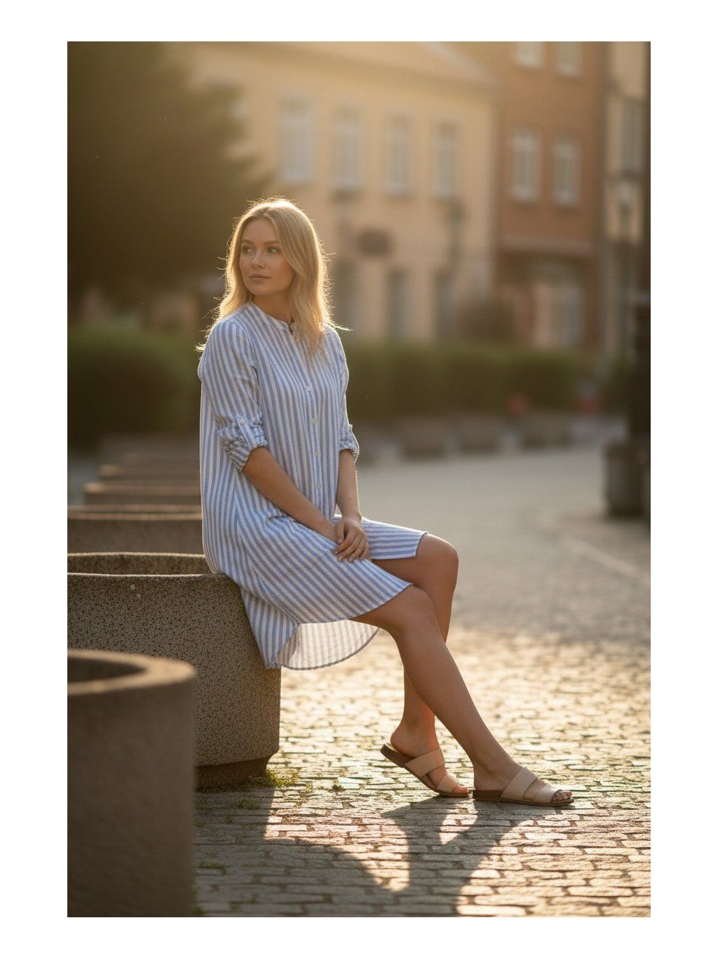 Ľahké a vzdušné košeľové šaty z príjemnej bavlny sú ideálnou voľbou na teplé letné dni. Jemný modrý odtieň v kombinácii s decentným prúžkom pôsobí sviežo, žensky a prirodzene elegantne.