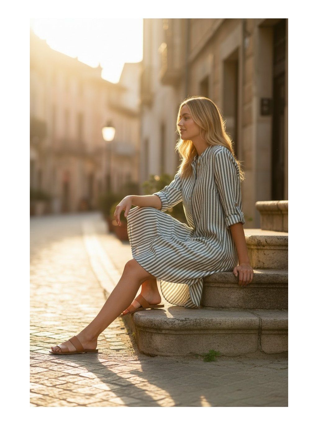 Ľahké a vzdušné košeľové šaty z príjemnej bavlny sú ideálnou voľbou na teplé letné dni. Olivový odtieň v kombinácii s decentným prúžkom pôsobí sviežo, žensky a prirodzene elegantne.