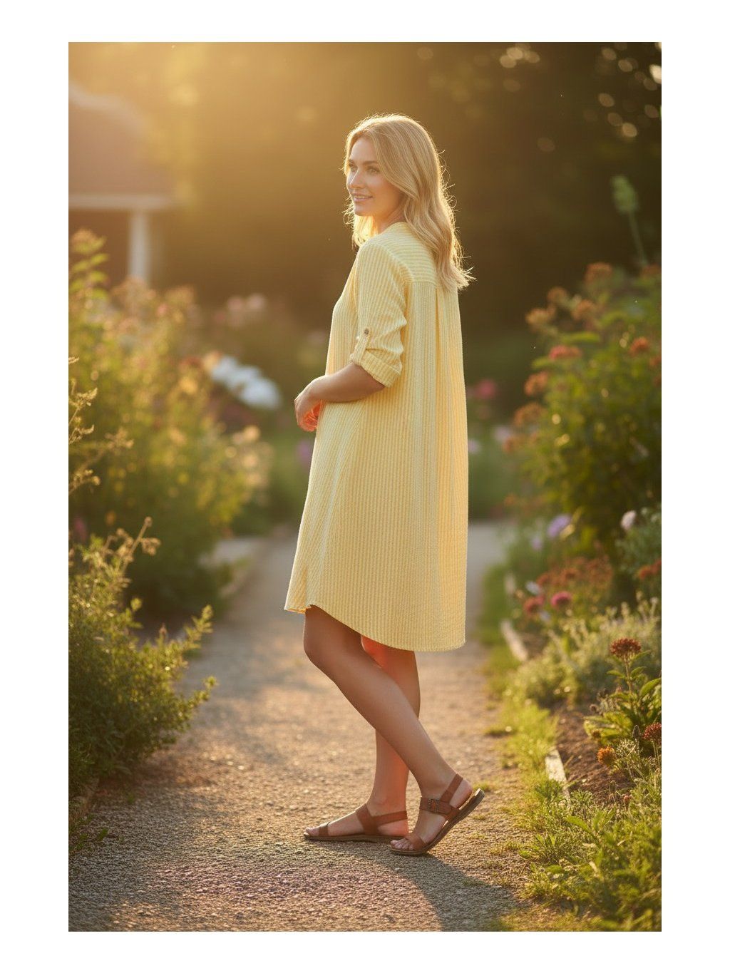 Ľahké a vzdušné košeľové šaty z príjemnej bavlny sú ideálnou voľbou na teplé letné dni. Jemný žltý odtieň v kombinácii s decentným prúžkom pôsobí sviežo, žensky a prirodzene elegantne.