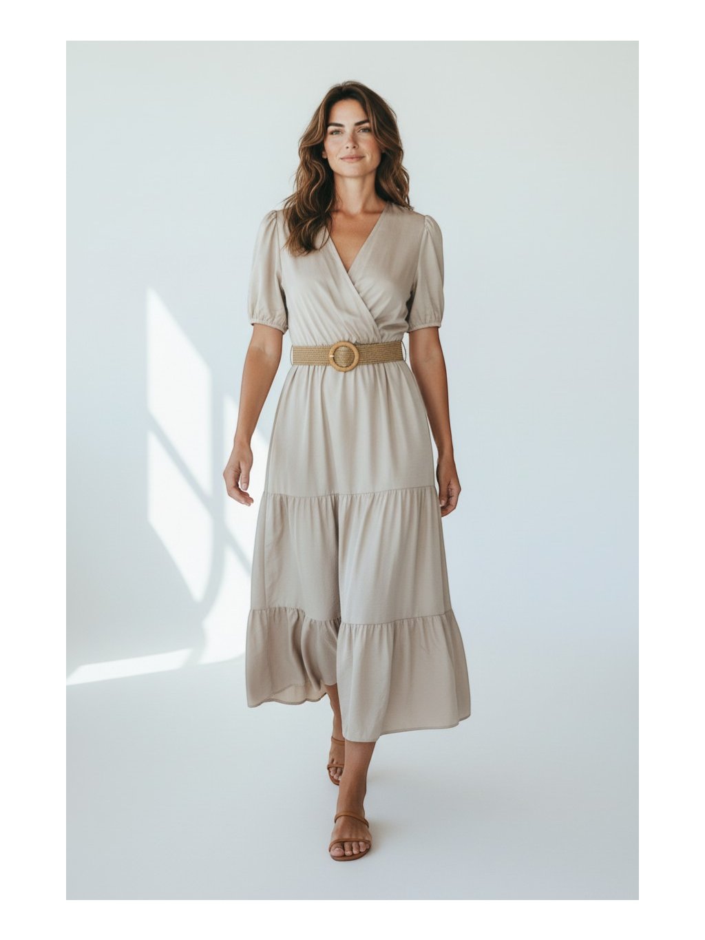 Tieto elegantné béžové midi šaty pôsobia nadčasovo a veľmi žensky, pričom v sebe spájajú jednoduchosť s jemnými detailmi. Vrchná časť so zavinovacím výstrihom do „V“ krásne zvýrazňuje dekolt a dodáva siluete ľahkosť, zatiaľ čo krátke, mierne naberané rukávy pridávajú romantický nádych. V páse sú šaty na gumičku a sú stiahnuté výrazným opaskom z prírodného materiálu s okrúhlou prackou, ktorý zvýrazňuje líniu pásu a vytvára lichotivú proporciu postavy. Sukňová časť je vrstvená a jemne riasená, vďaka čomu pôsobí vzdušne a pri pohybe elegantne splýva. Celkový dojem dopĺňa príjemný, ľahký materiál, ktorý zaručuje komfort počas nosenia, a robí z týchto šiat ideálnu voľbu na bežné dni aj štýlové príležitosti.