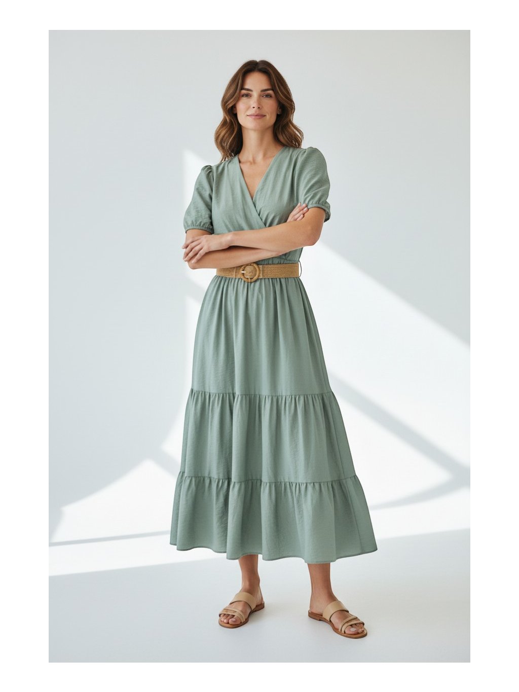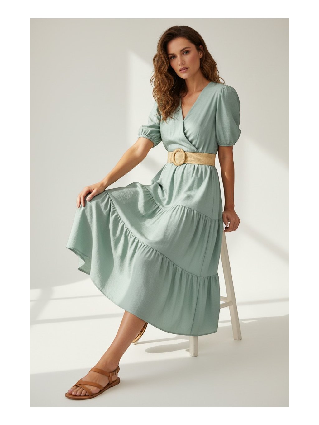 Tieto elegantné mentolové midi šaty pôsobia nadčasovo a veľmi žensky, pričom v sebe spájajú jednoduchosť s jemnými detailmi. Vrchná časť so zavinovacím výstrihom do „V“ krásne zvýrazňuje dekolt a dodáva siluete ľahkosť, zatiaľ čo krátke, mierne naberané rukávy pridávajú romantický nádych. V páse sú šaty na gumičku a sú stiahnuté výrazným opaskom z prírodného materiálu s okrúhlou prackou, ktorý zvýrazňuje líniu pásu a vytvára lichotivú proporciu postavy. Sukňová časť je vrstvená a jemne riasená, vďaka čomu pôsobí vzdušne a pri pohybe elegantne splýva. Celkový dojem dopĺňa príjemný, ľahký materiál, ktorý zaručuje komfort počas nosenia, a robí z týchto šiat ideálnu voľbu na bežné dni aj štýlové príležitosti.