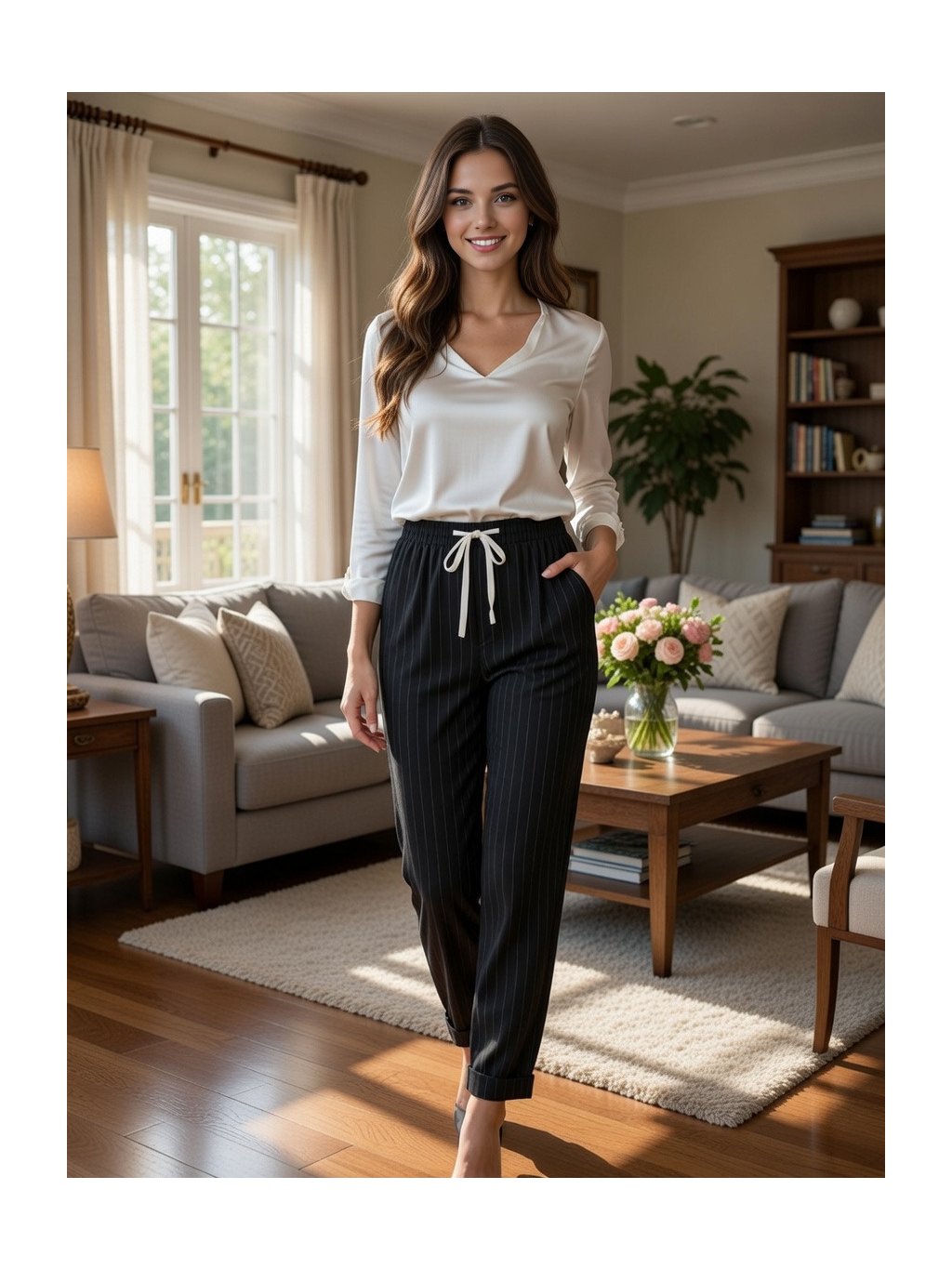 Elegantné pruhované lounge nohavice s kontrastnou bielou šnúrkou - pohodlie stretáva štýl. Kombinuj s hodvábnym topom pre sofistikvaný casual outfit.