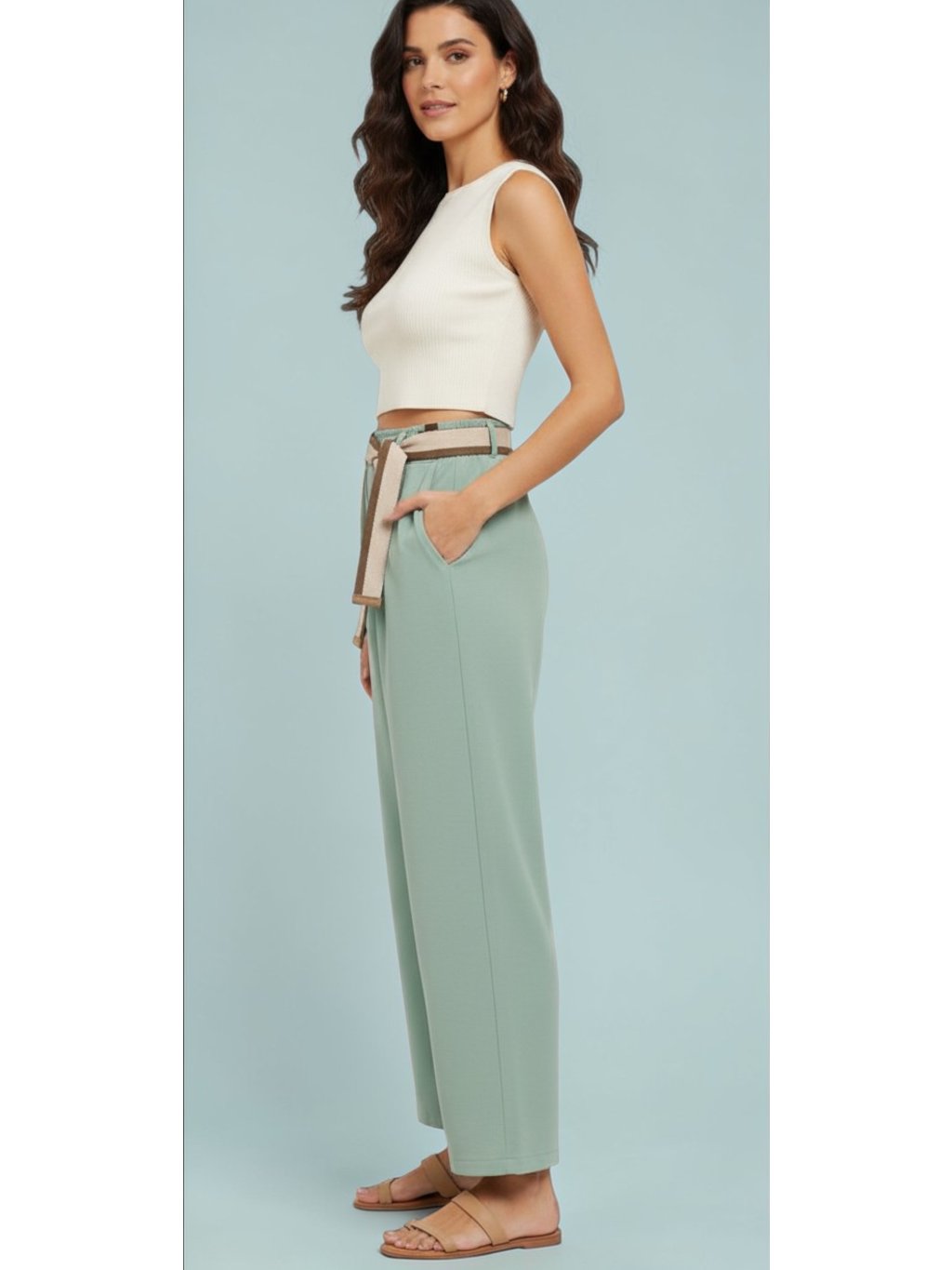 Mintové dámske nohavice v modernom, ležérno-elegantnom strihu sú ideálnou voľbou na jarné a letné dni. Nohavice majú pohodlný, voľnejší rovný strih s dostatočnou dĺžkou, ktorý lichotí postave a zároveň zabezpečuje maximálny komfort pri nosení. V páse sú zakončené pružnou gumou a doplnené štýlovým opaskom na zaväzovanie, ktorý dodáva outfitu šmrnc a umožňuje prispôsobenie podľa potreby.