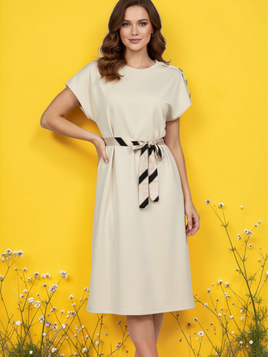 Tieto elegantné midi šaty v jemnom béžovom odtieni predstavujú dokonalú kombináciu pohodlia a ženského štýlu. Voľnejší strih s krátkymi rukávmi pôsobí vzdušne a prirodzene splýva s postavou, zatiaľ čo opasok v páse s decentným prúžkovaným vzorom krásne zvýrazňuje siluetu a dodáva celku šmrnc. Mäkký, príjemný materiál zaručuje komfort počas celého dňa, či už sa vydáte na prechádzku mestom, do práce alebo na neformálne stretnutie. Minimalistický dizajn doplnený jemnými detailmi robí z týchto šiat univerzálny kúsok, ktorý ľahko skombinujete s rôznymi doplnkami a obuvou.