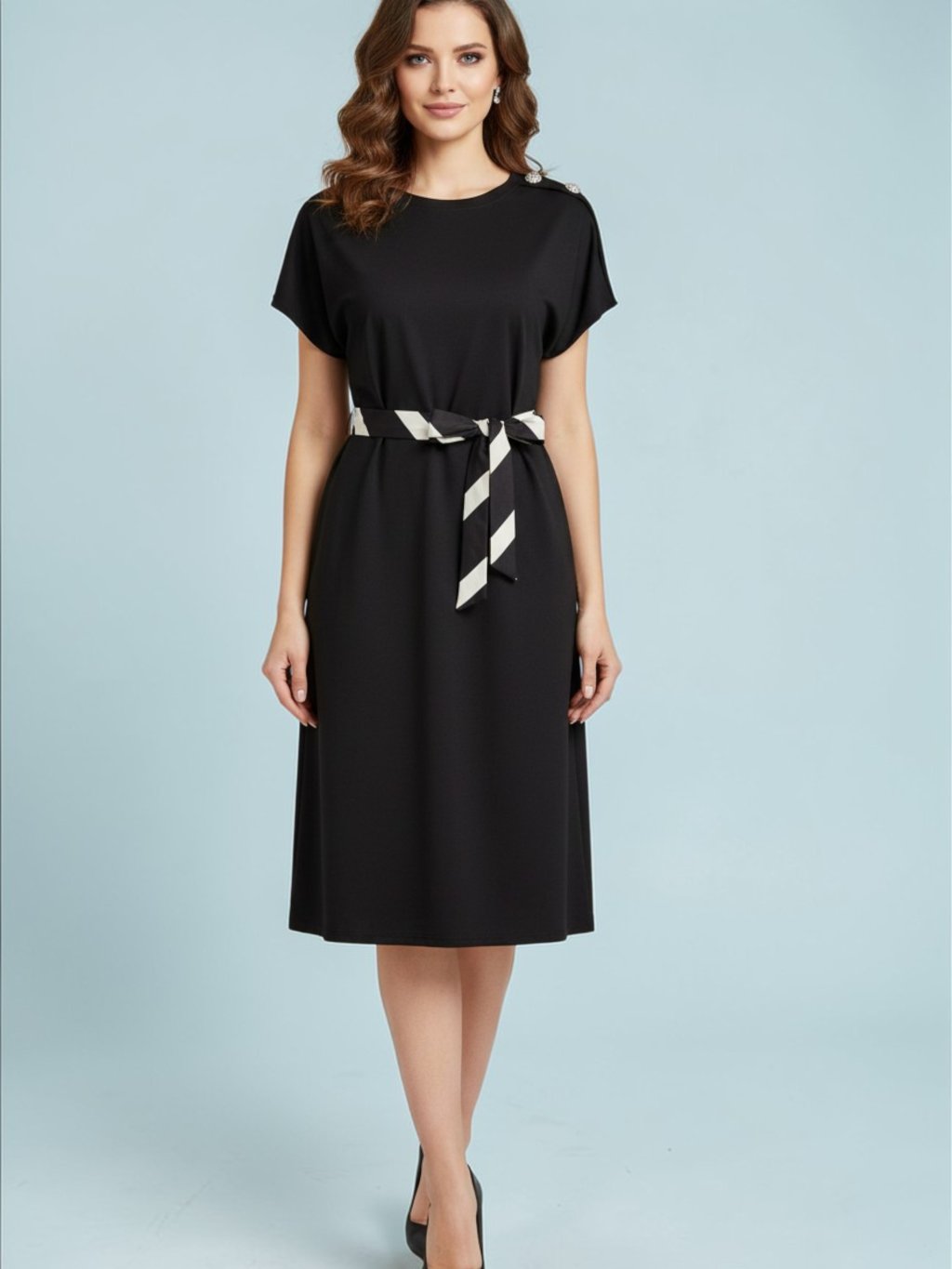 Tieto elegantné midi šaty v nadčasovom čiernom odtieni predstavujú dokonalú kombináciu pohodlia a ženského štýlu. Voľnejší strih s krátkymi rukávmi pôsobí vzdušne a prirodzene splýva s postavou, zatiaľ čo opasok v páse s decentným prúžkovaným vzorom krásne zvýrazňuje siluetu a dodáva celku šmrnc. Mäkký, príjemný materiál zaručuje komfort počas celého dňa, či už sa vydáte na prechádzku mestom, do práce alebo na neformálne stretnutie. Minimalistický dizajn doplnený jemnými detailmi robí z týchto šiat univerzálny kúsok, ktorý ľahko skombinujete s rôznymi doplnkami a obuvou.