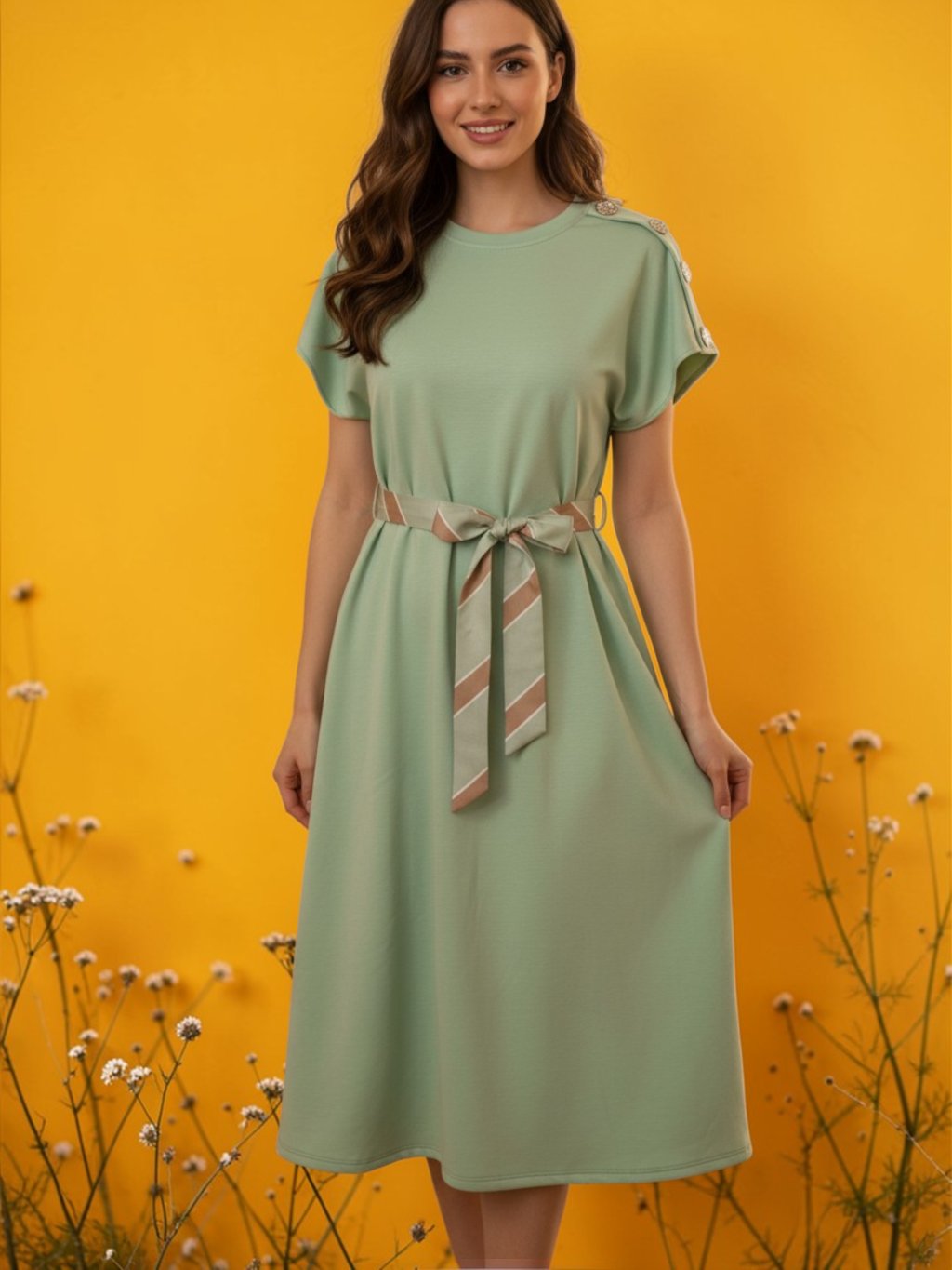 Tieto elegantné midi šaty v jemnom mentolovom odtieni predstavujú dokonalú kombináciu pohodlia a ženského štýlu. Voľnejší strih s krátkymi rukávmi pôsobí vzdušne a prirodzene splýva s postavou, zatiaľ čo opasok v páse s decentným prúžkovaným vzorom krásne zvýrazňuje siluetu a dodáva celku šmrnc. Mäkký, príjemný materiál zaručuje komfort počas celého dňa, či už sa vydáte na prechádzku mestom, do práce alebo na neformálne stretnutie. Minimalistický dizajn doplnený jemnými detailmi robí z týchto šiat univerzálny kúsok, ktorý ľahko skombinujete s rôznymi doplnkami a obuvou.