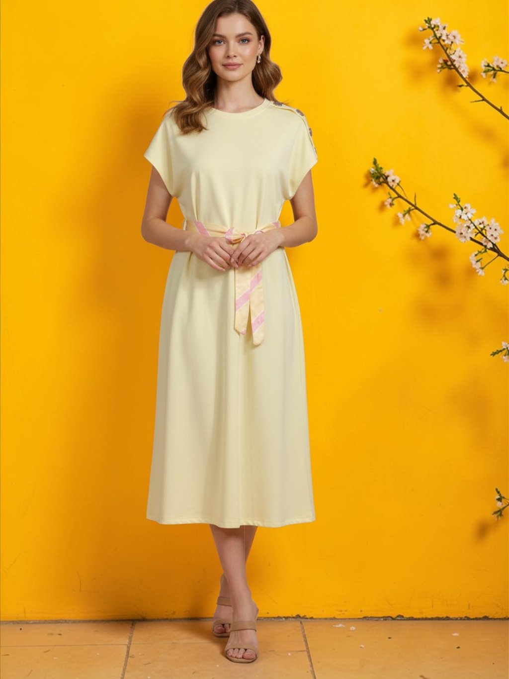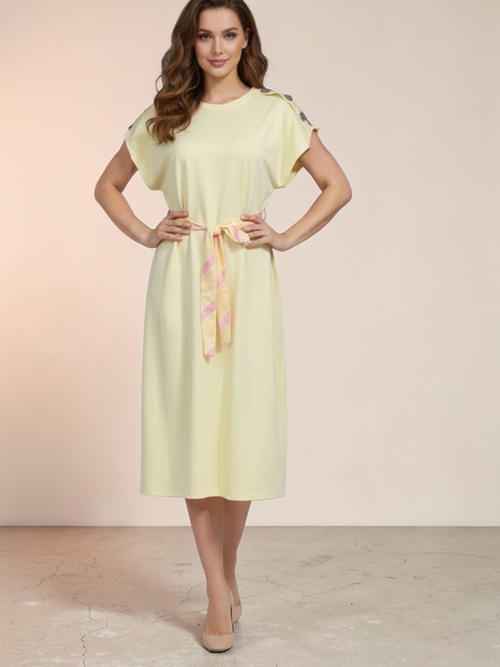 Tieto elegantné midi šaty v jemnom žltom odtieni predstavujú dokonalú kombináciu pohodlia a ženského štýlu. Voľnejší strih s krátkymi rukávmi pôsobí vzdušne a prirodzene splýva s postavou, zatiaľ čo opasok v páse s decentným prúžkovaným vzorom krásne zvýrazňuje siluetu a dodáva celku šmrnc. Mäkký, príjemný materiál zaručuje komfort počas celého dňa, či už sa vydáte na prechádzku mestom, do práce alebo na neformálne stretnutie. Minimalistický dizajn doplnený jemnými detailmi robí z týchto šiat univerzálny kúsok, ktorý ľahko skombinujete s rôznymi doplnkami a obuvou.