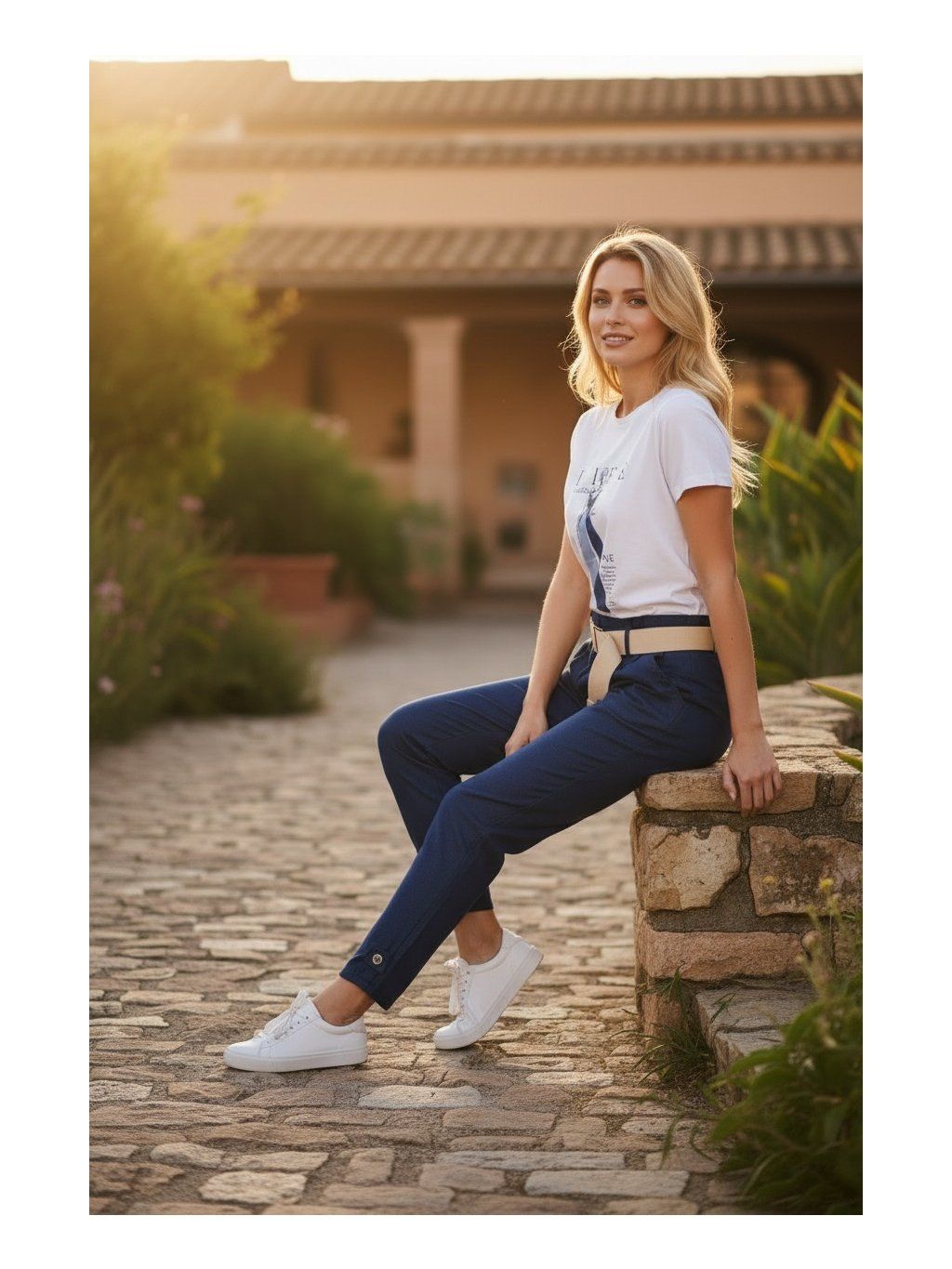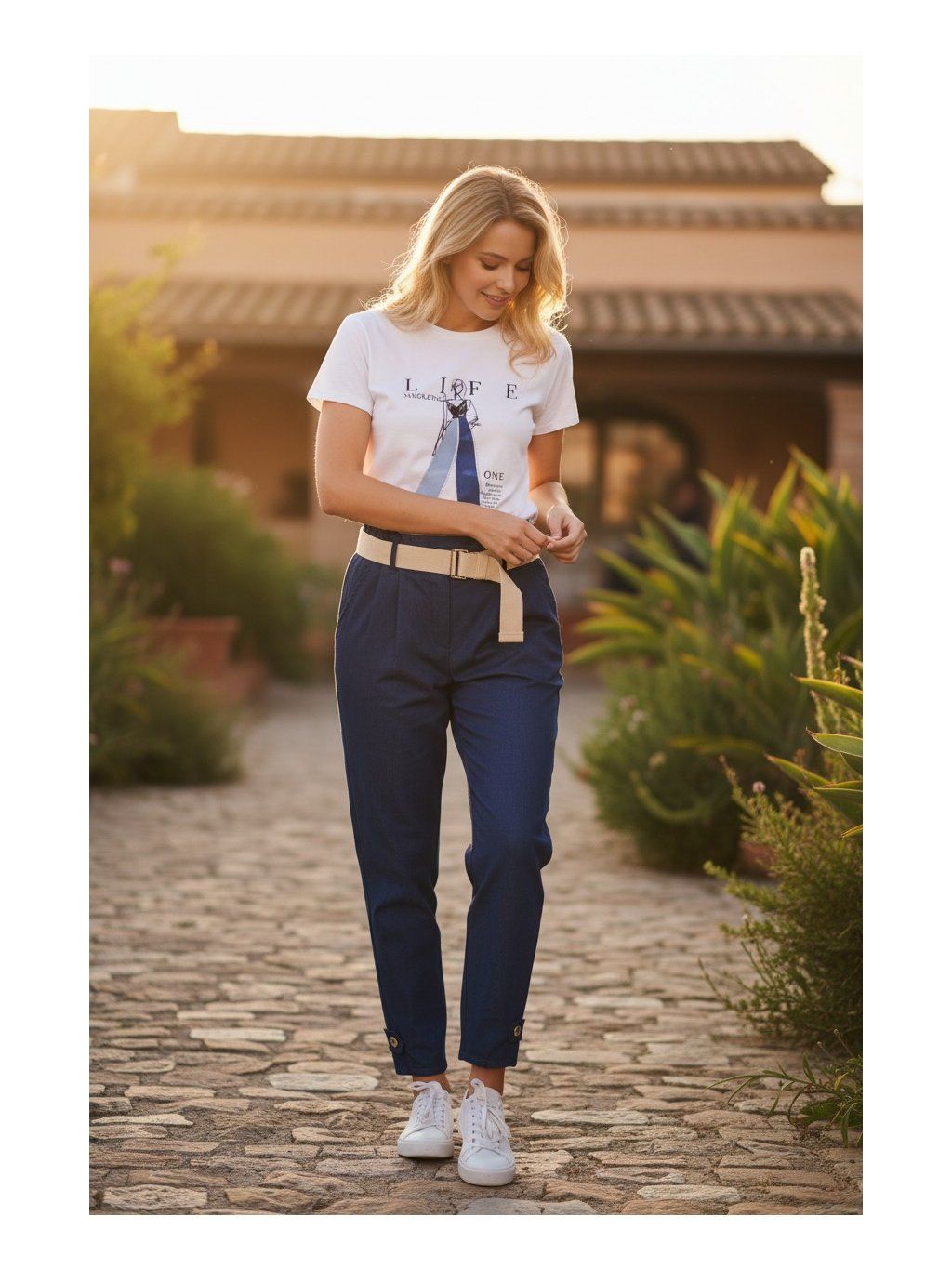 Elastický pás na gumu sa dokonale prispôsobí postave a v kombinácii s opaskom vytvára praktický aj štýlový detail. Zúžený strih nohavíc jemne kopíruje siluetu a zakončenie pri členkoch pôsobí moderne a upravene.