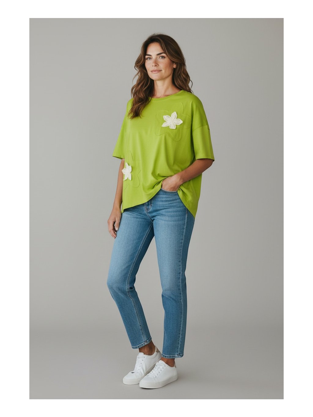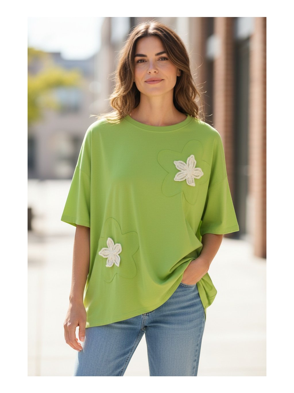 Tento oversize top je voľného strihu v zelenej farbe a pôsobí pohodlne a moderne zároveň. Má krátke, širšie rukávy so spadnutými ramenami a klasický okrúhly výstrih. Jeho zaujímavosťou je asymetrický strih, kde je predná časť mierne kratšia a zadná predĺžená, čo dodáva celkovému vzhľadu ležérnu dynamiku. Na prednej strane sa nachádzajú výrazné kvetinové aplikácie, ktoré tričku pridávajú jemný ženský a dekoratívny prvok. Materiál pôsobí mäkko a príjemne, a je vhodný na každodenné nosenie. Vďaka svojmu voľnému strihu je tričko vhodné aj pre veľkosť XL, keďže neobopína postavu, poskytuje dostatok priestoru a zároveň lichotí rôznym typom postavy.