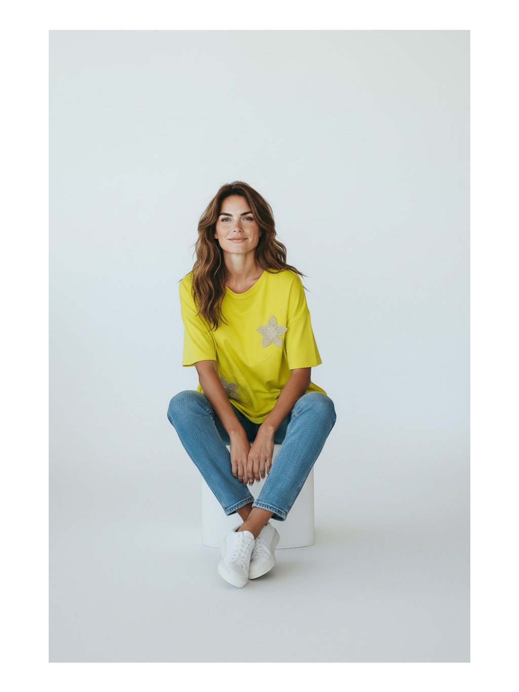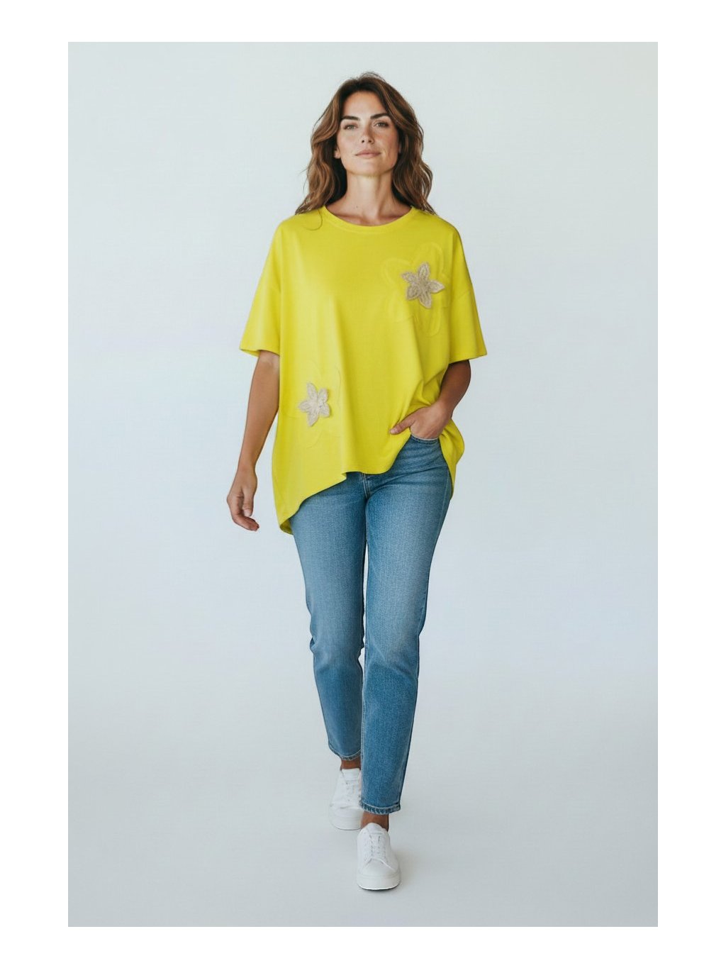 Tento oversize top je voľného strihu v jarnej žltej farbe a pôsobí pohodlne a moderne zároveň. Má krátke, širšie rukávy so spadnutými ramenami a klasický okrúhly výstrih. Jeho zaujímavosťou je asymetrický strih, kde je predná časť mierne kratšia a zadná predĺžená, čo dodáva celkovému vzhľadu ležérnu dynamiku. Na prednej strane sa nachádzajú výrazné kvetinové aplikácie, ktoré tričku pridávajú jemný ženský a dekoratívny prvok. Materiál pôsobí mäkko a príjemne, a je vhodný na každodenné nosenie. Vďaka svojmu voľnému strihu je tričko vhodné aj pre veľkosť XL, keďže neobopína postavu, poskytuje dostatok priestoru a zároveň lichotí rôznym typom postavy.