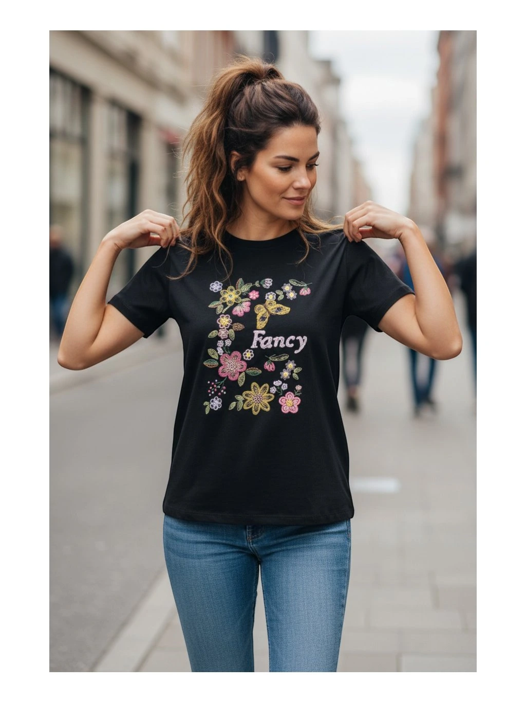 Prednú časť zdobí hravá kvetinová potlač v kombinácii pastelových farieb, ktorá je doplnená nápisom „Fancy“. Motív pôsobí ľahko a optimisticky, vnáša do outfitu sviežosť a mladistvú energiu. Materiál je hladký a príjemný na dotyk, čo ešte umocňuje celkový pocit komfortu.