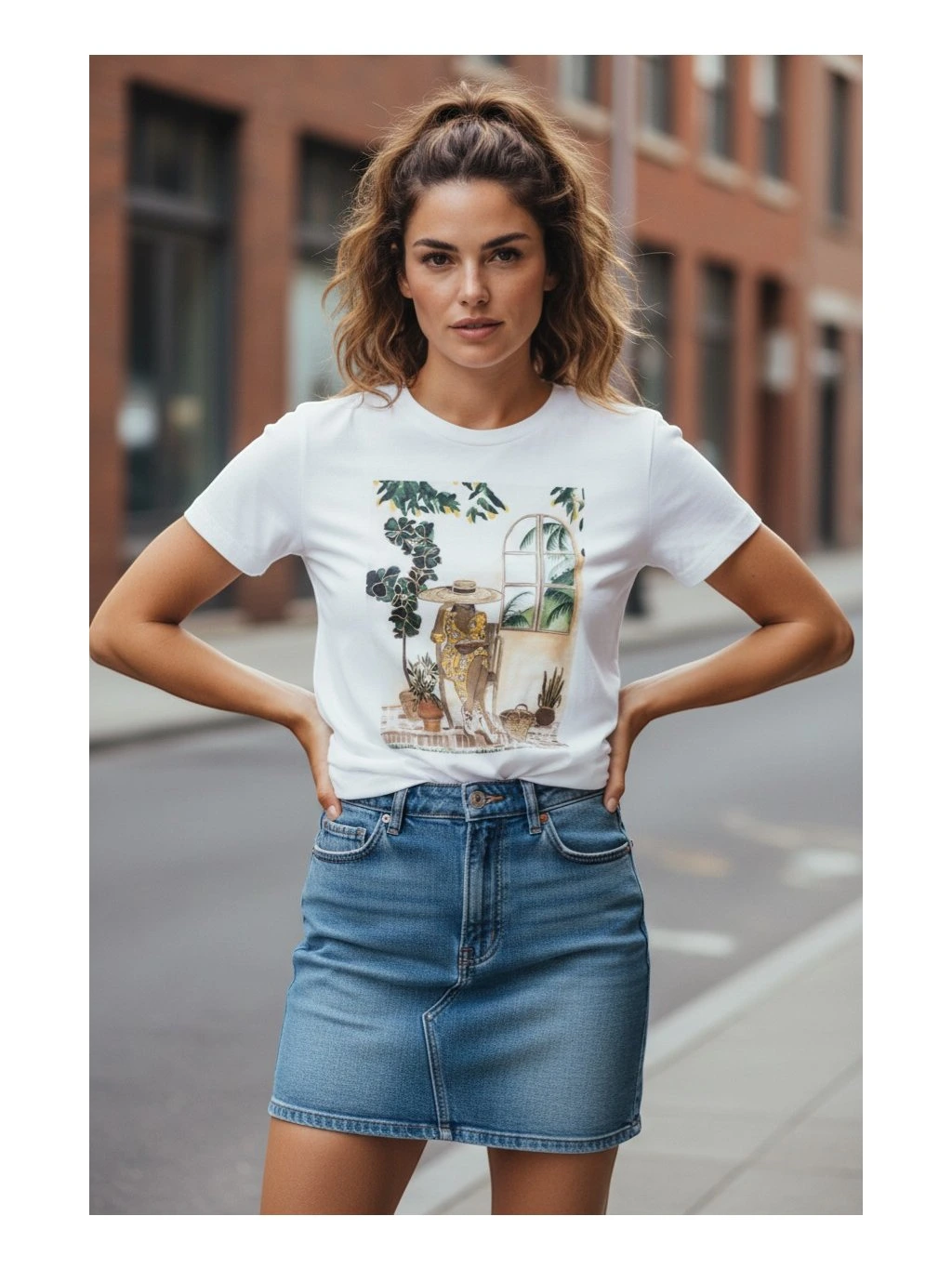 Prednú časť zdobí výrazná ilustrácia s dovolenkovou atmosférou – ženská postava v klobúku, obklopená zeleňou a interiérovými detailmi, evokuje pocit pokoja, slnka a letnej pohody. Motív pôsobí jemne umelecky a zároveň veľmi vkusne, čím dodáva tričku jedinečný charakter.