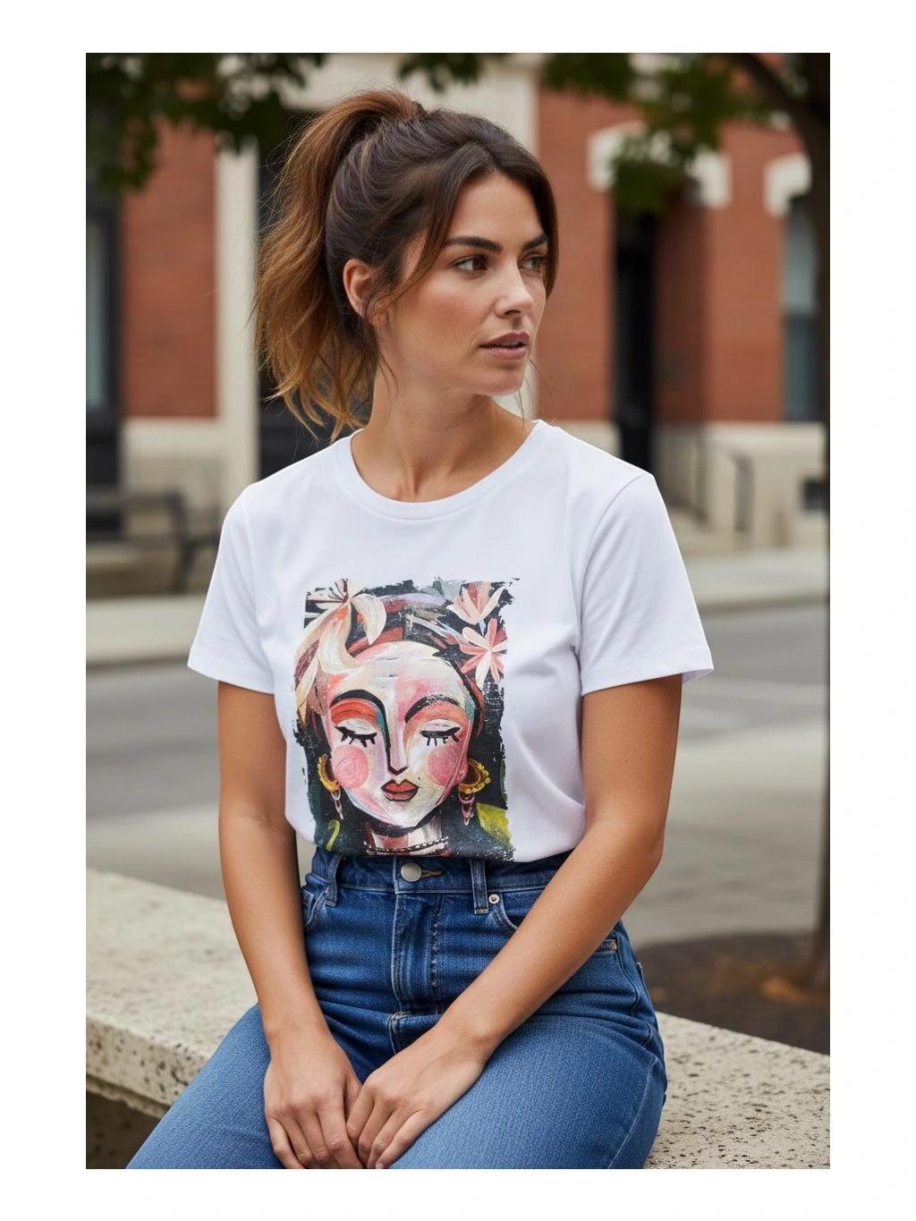 Prednú časť zdobí výrazná ilustrácia ženskej tváre v štýle moderného umenia, s jemne abstraktnými líniami a harmonickou hrou farieb. Teplé odtiene ružovej, červenej a béžovej v kombinácii s tmavším pozadím vytvárajú zaujímavý kontrast a dodávajú tričku výraznú vizuálnu hĺbku. Motív pôsobí kreatívne, sebavedomo a mierne bohémsky.