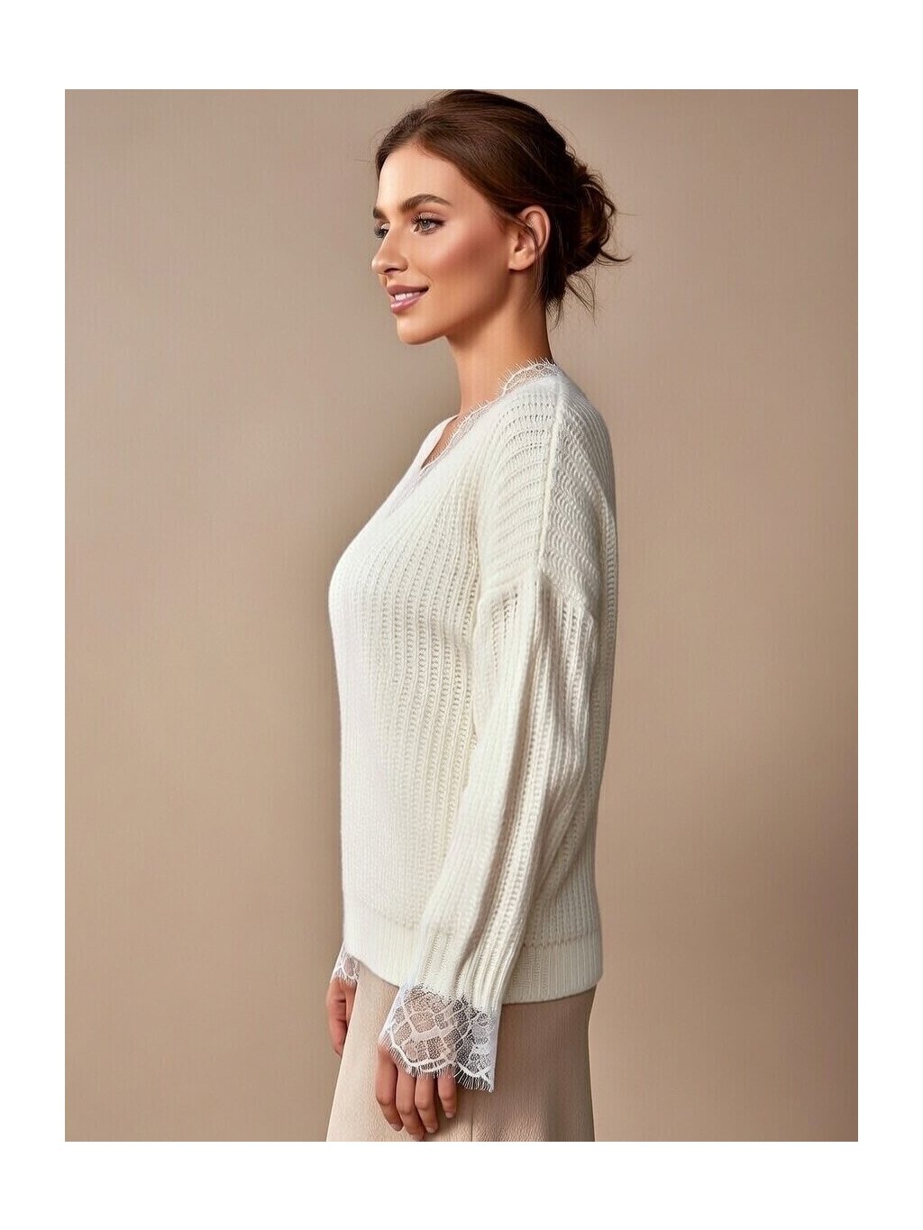 Elegantný biely pletený top s výstrihom do V je doplnený jemnou čipkou, ktorá mu dodáva ženský a sofistikovaný vzhľad. Mäkký a príjemný materiál zabezpečuje komfort pri nosení, zatiaľ čo voľnejší strih lichotí postave a umožňuje jednoduché kombinovanie. Čipkové detaily pri výstrihu a na rukávoch podčiarkujú nadčasový štýl, vďaka ktorému je top ideálny na bežné nosenie aj na elegantnejšie príležitosti.