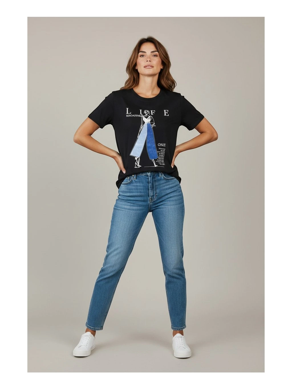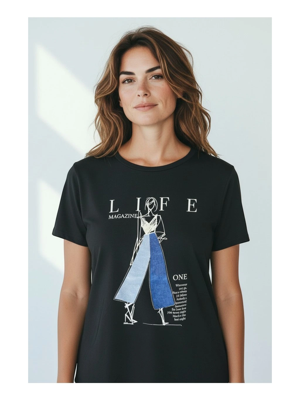 Dominantným prvkom je originálna grafická potlač v prednej časti. Kombinuje módnu ilustráciu postavy s minimalistickými líniami a textovými detailmi v štýle fashion magazínu.