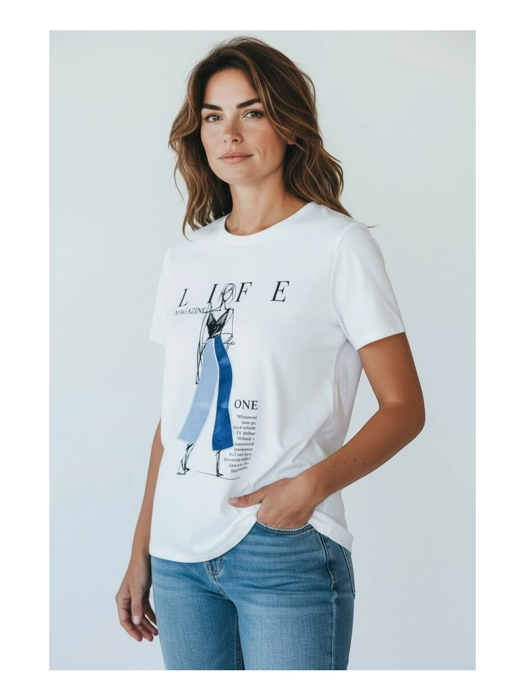 Dominantným prvkom je originálna grafická potlač v prednej časti. Kombinuje módnu ilustráciu postavy s minimalistickými líniami a textovými detailmi v štýle fashion magazínu.