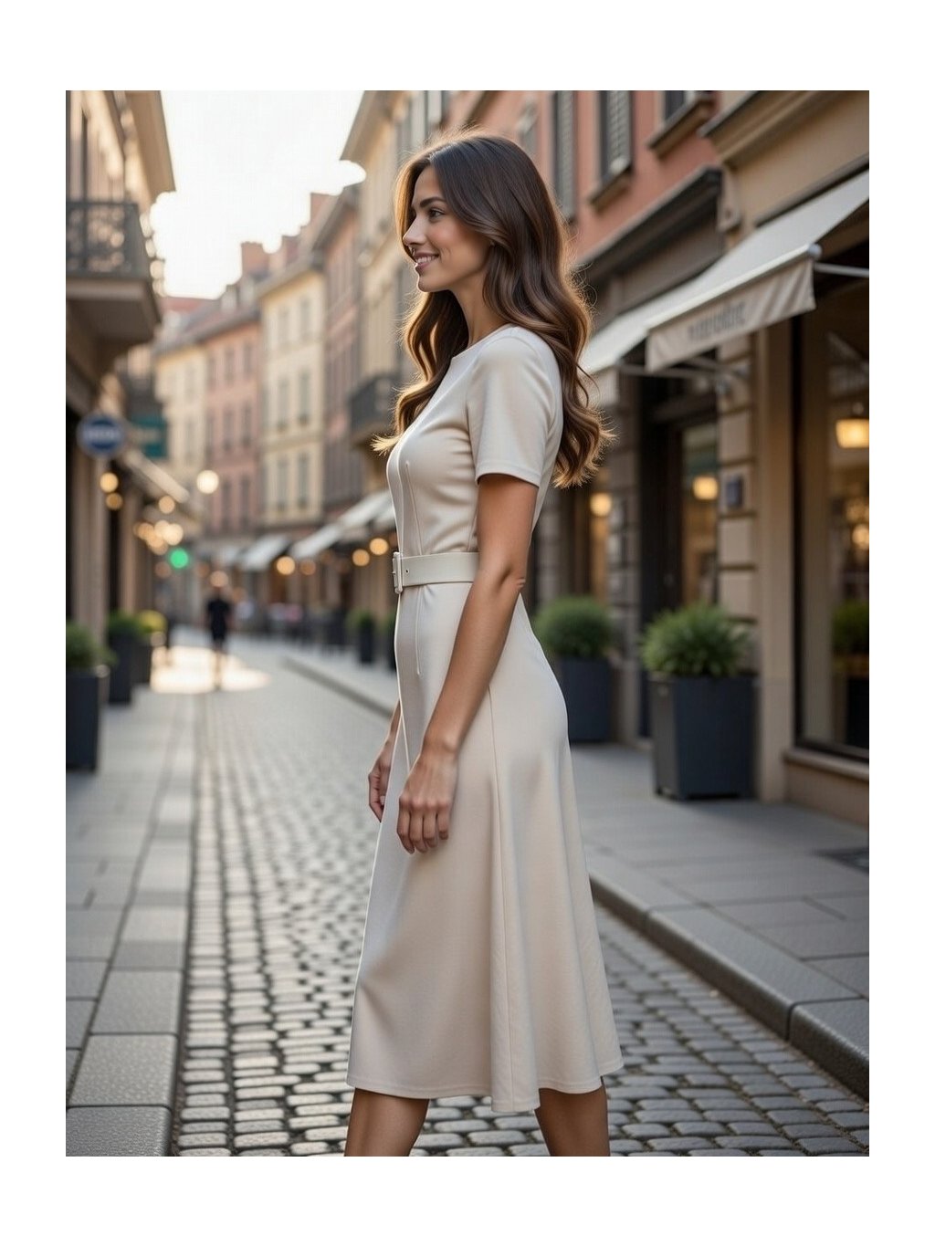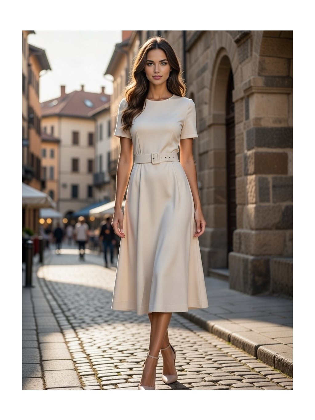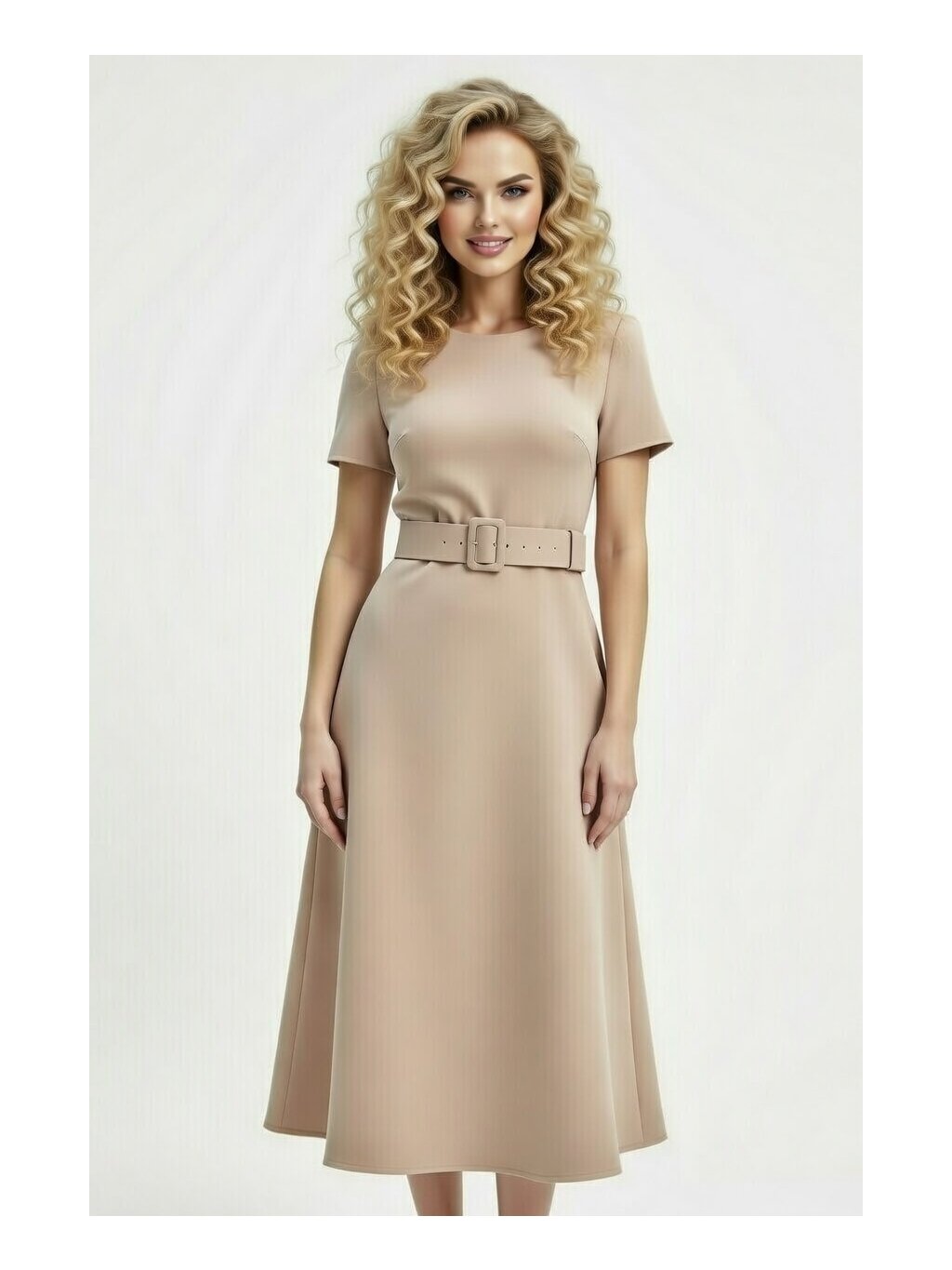 Jemne priliehavé midi šaty s krátkym rukávom zvýraznia siluetu a zároveň pôsobia sofistikovane a veľmi vkusne. Čisté línie dopĺňa elegantný opasok v tóne šiat, ktorý krásne zvýrazní pás a dodá outfitu štruktúru. Jemný, hladký materiál je príjemný na dotyk, pohodlný na nosenie a ideálny na celodenné využitie.Midi dĺžka pôsobí žensky a univerzálne – vhodná do práce, na obchodné stretnutie, ale aj na kávu v meste či spoločenskú udalosť. Šaty sa dajú jednoducho kombinovať s lodičkami, sandálmi aj elegantnými čižmami.