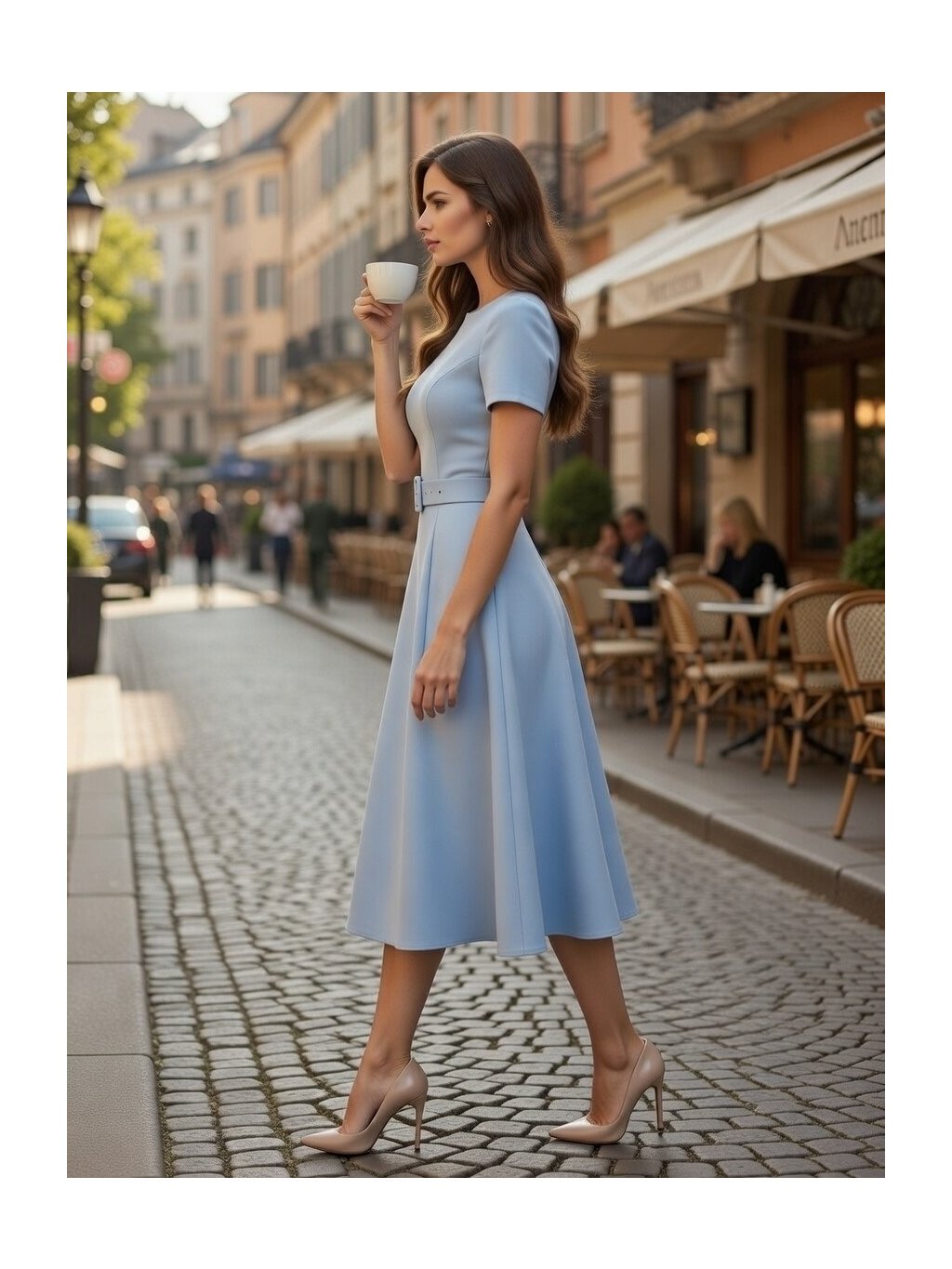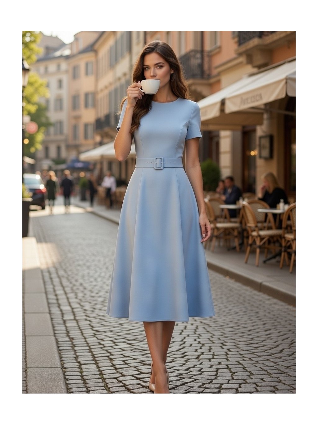 Jemne priliehavé midi šaty v jemnej baby modrej farbe s krátkym rukávom zvýraznia siluetu a zároveň pôsobia sofistikovane a veľmi vkusne. Čisté línie dopĺňa elegantný opasok v tóne šiat, ktorý krásne zvýrazní pás a dodá outfitu štruktúru. Jemný, hladký materiál je príjemný na dotyk, pohodlný na nosenie a ideálny na celodenné využitie.Midi dĺžka pôsobí žensky a univerzálne – vhodná do práce, na obchodné stretnutie, ale aj na kávu v meste či spoločenskú udalosť. Šaty sa dajú jednoducho kombinovať s lodičkami, sandálmi aj elegantnými čižmami.