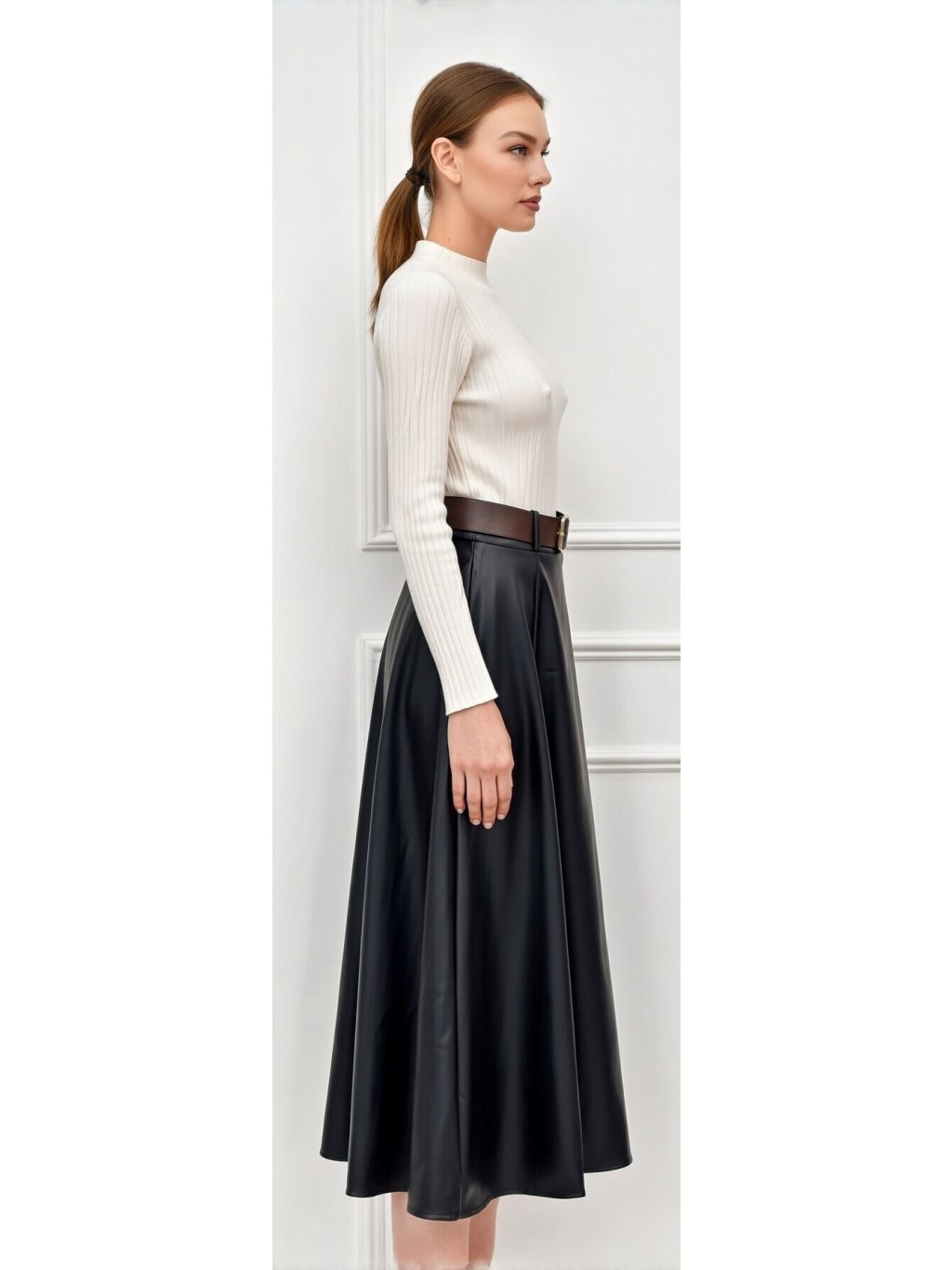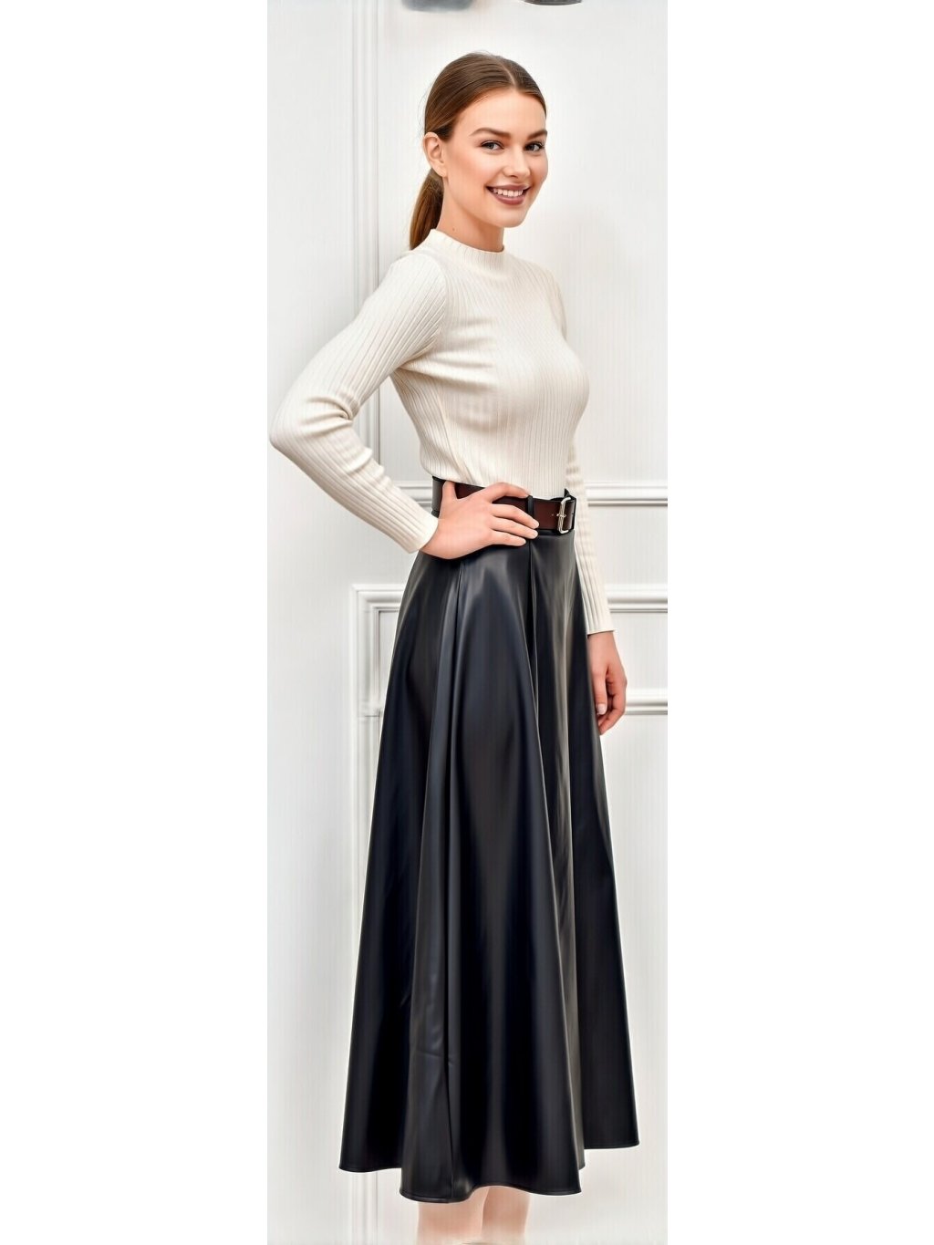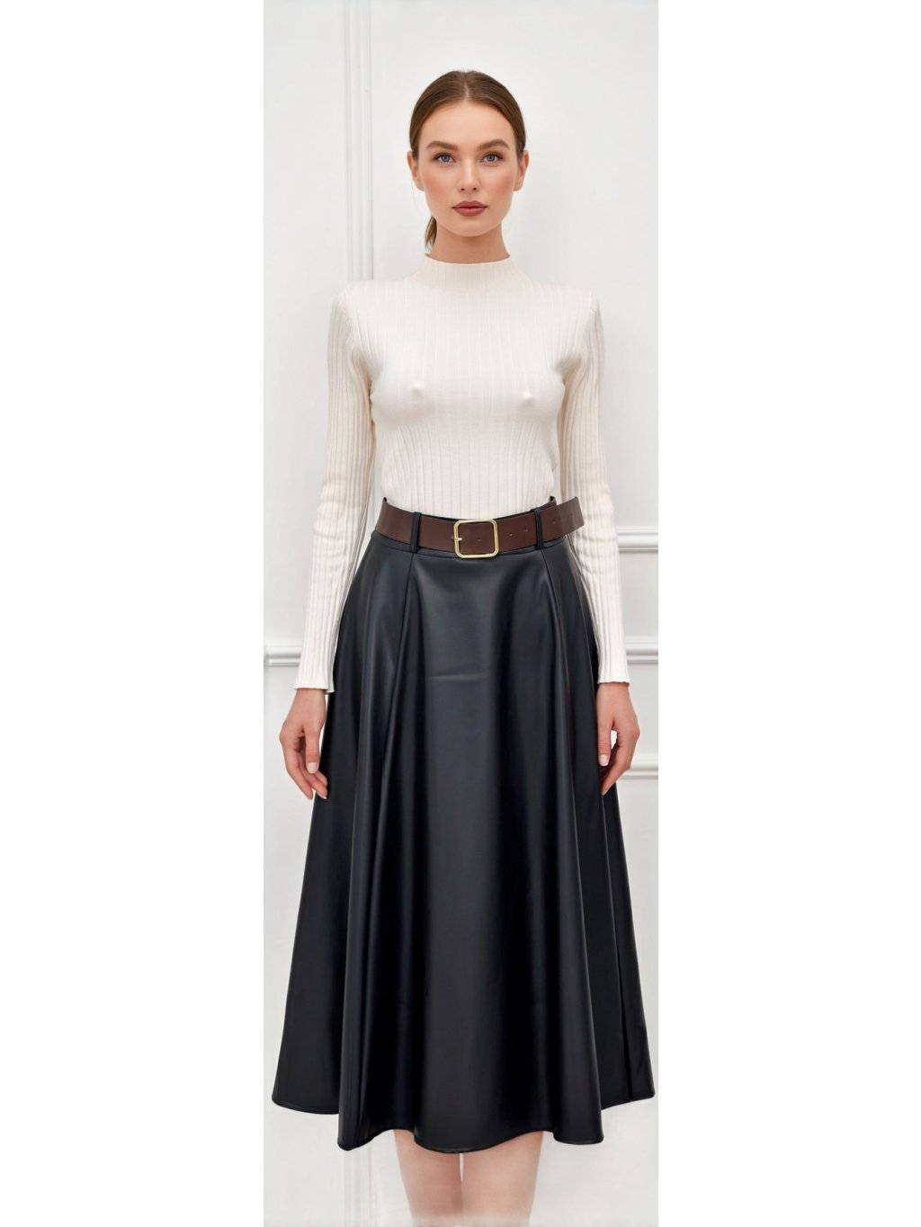 Táto čierna sukňa je midi dĺžky, siaha približne po lýtka. Má rozšírený strih do tvaru A, vďaka čomu pôsobí elegantne a pekne splýva pri chôdzi. Materiál vyzerá ako hladká koženka alebo jemná umelá koža s miernym leskom, čo jej dodáva sofistikovaný, moderný vzhľad.V páse je sukňa zvýraznená hnedým opaskom so zlatou prackou, ktorý kontrastuje s čiernou farbou a zvýrazňuje siluetu. Horná časť je hladká, bez výrazných vzorov, zatiaľ čo spodná časť je jemne nariasená, čím pôsobí žensky a upravene.