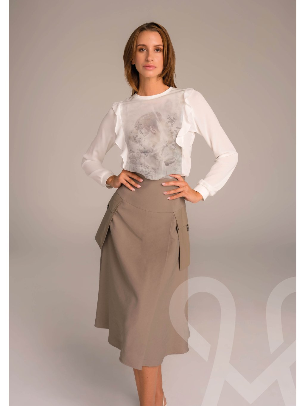 Elegantný MAGENTA top v bielej farbe rovného strihu s klasickým okrúhlym golierikom. Dlhé rukávy sú zakončené manžetami. Po bokoch predného dielu sa nachádzajú jemné volániky, ktoré dodávajú romantický a ženský charakter. Na prednej časti je polopriesvitná látka s potlačou – viditeľný je umelecký motív ženy s kvetmi v jemne šedej až pastelovej farebnosti. Celkovo pôsobí top veľmi sofistikovane, romanticky a hodí sa napríklad ku sukniam či elegantným nohaviciam.