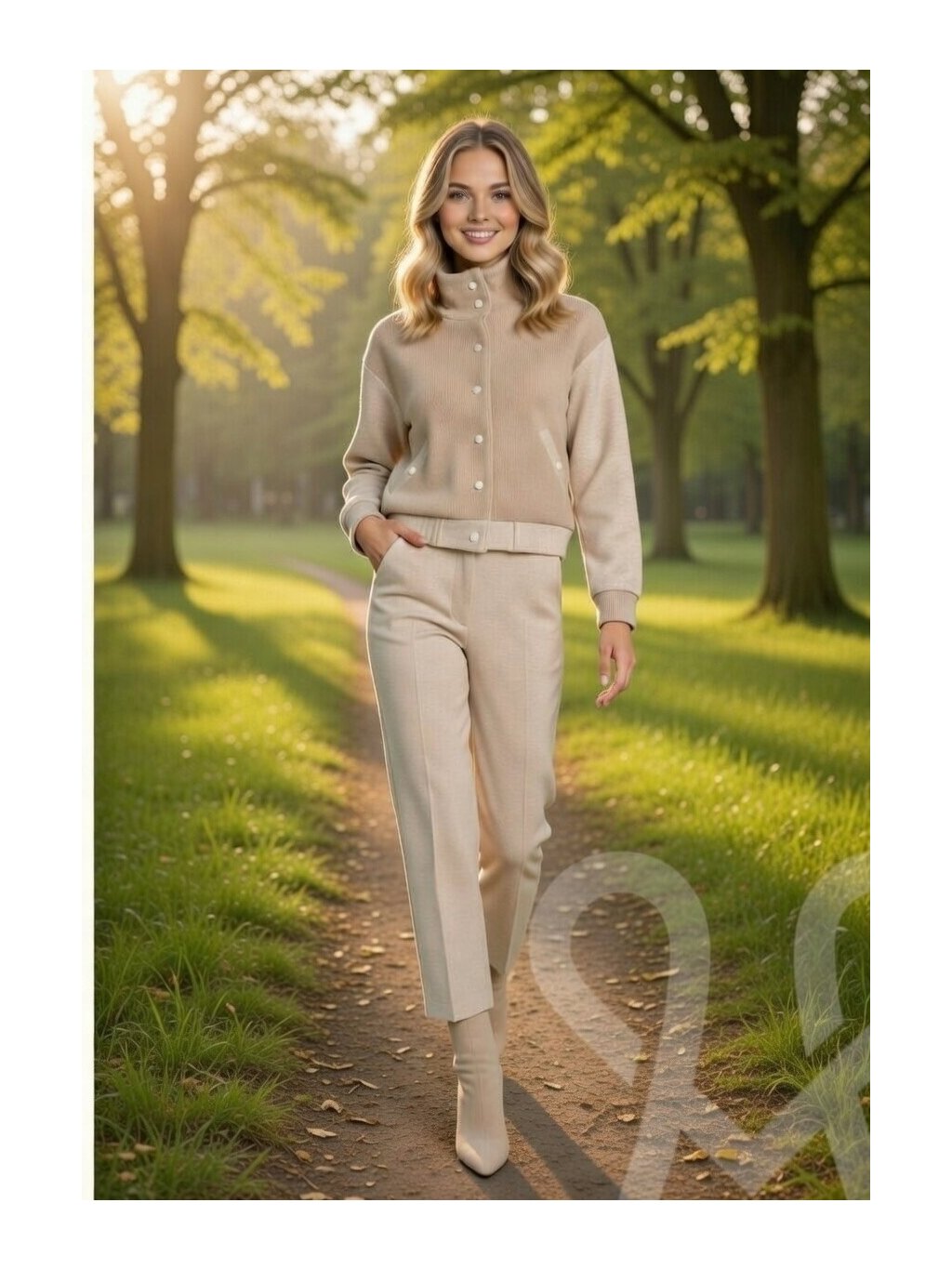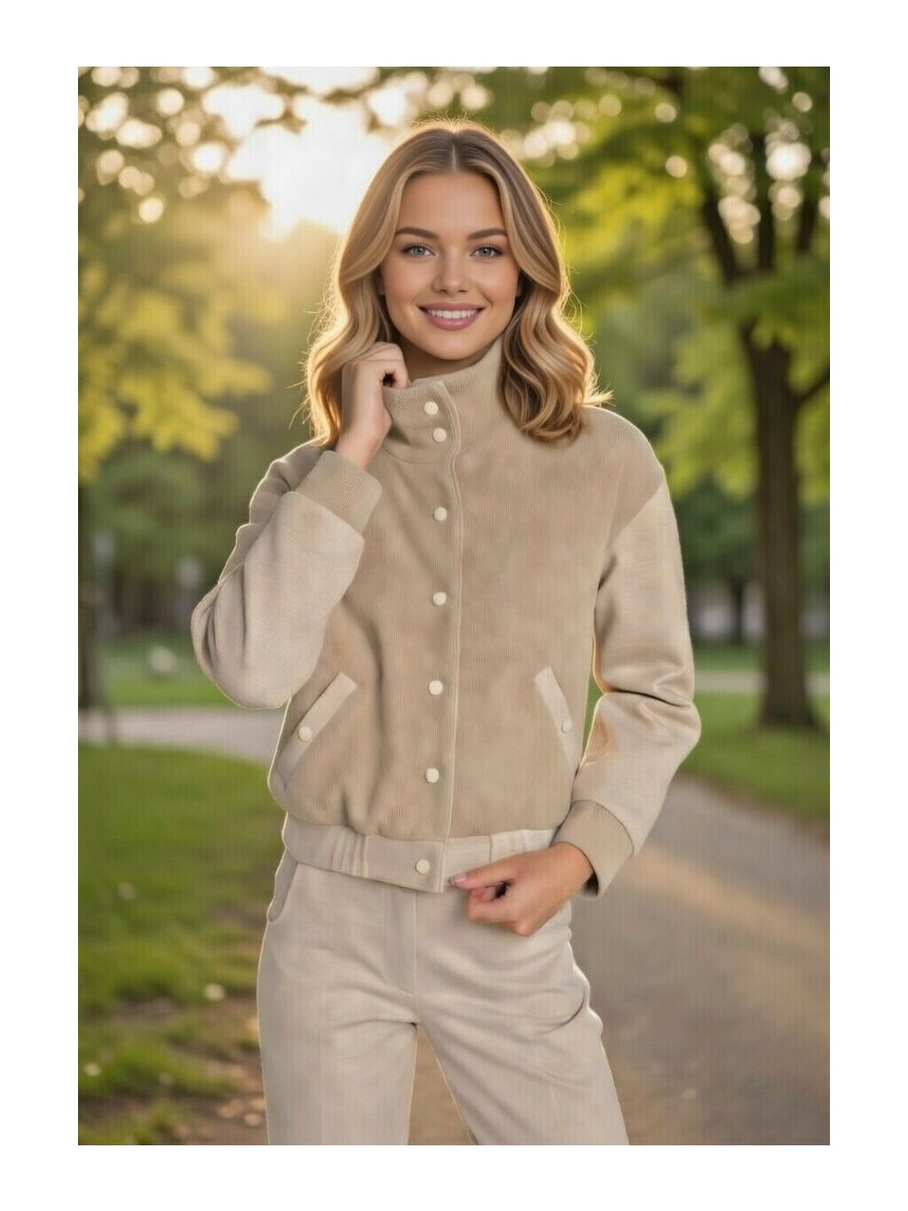 Dámska krátka MAGENTA bunda v športovo-elegantnom štýle, ktorá spája pohodlie a moderný dizajn. Bunda je vyhotovená v jemnej béžovo-krémovej farebnej kombinácii, vďaka čomu pôsobí nadčasovo a ľahko sa kombinuje. Má stojačikový golier, ktorý chráni pred chladom a zároveň dodáva modelu sofistikovaný vzhľad. Predná časť sa zapína na rad gombíkov v rovnakej farbe, čo podčiarkuje čistý a harmonický dizajn. Rukávy a dolný lem sú zakončené elastickými manžetami, ktoré zaručujú pohodlné nosenie a udržujú tvar. Praktické bočné vrecká dopĺňajú celkový vzhľad a zvyšujú funkčnosť bundy. Tento kúsok je ideálny na prechodné obdobie – štýlový, pohodlný a univerzálny doplnok každodenného outfitu.