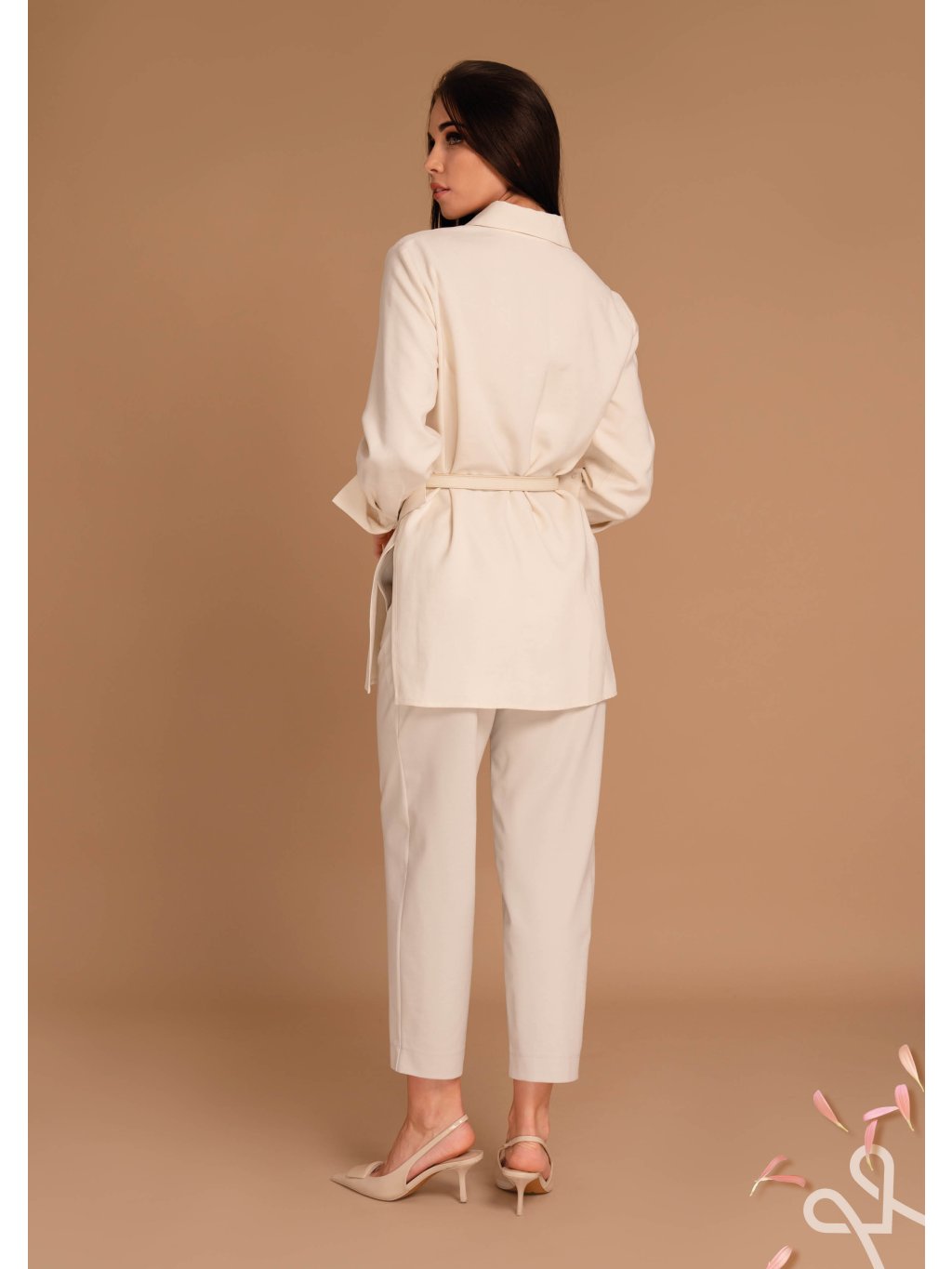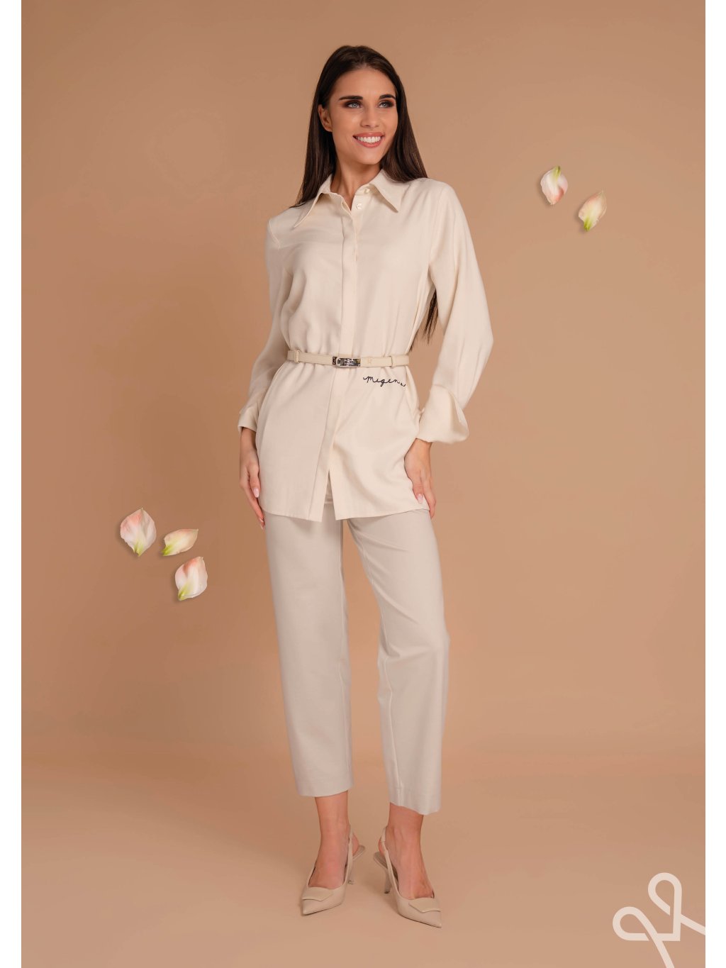 Táto MAGENTA košeľa v krémovo-béžovom odtieni má predĺžený, elegantný strih s klasickým golierom a skrytým zapínaním. V páse je možné ju doplniž úzkym opaskom, ktorý zvýrazní siluetu (opasok nie je súčasťou MAGENTA košele). Dlhé rukávy s výraznejšími manžetami a jemný, splývavý materiál dodávajú modelu nadčasový a sofistikovaný vzhľad vhodný do práce aj na elegantné denné nosenie.