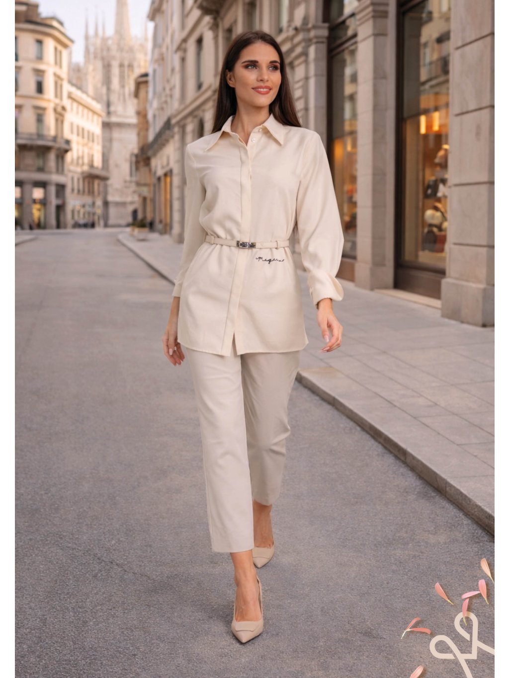 Táto MAGENTA košeľa v krémovo-béžovom odtieni má predĺžený, elegantný strih s klasickým golierom a skrytým zapínaním. V páse je možné ju doplniž úzkym opaskom, ktorý zvýrazní siluetu (opasok nie je súčasťou MAGENTA košele). Dlhé rukávy s výraznejšími manžetami a jemný, splývavý materiál dodávajú modelu nadčasový a sofistikovaný vzhľad vhodný do práce aj na elegantné denné nosenie.