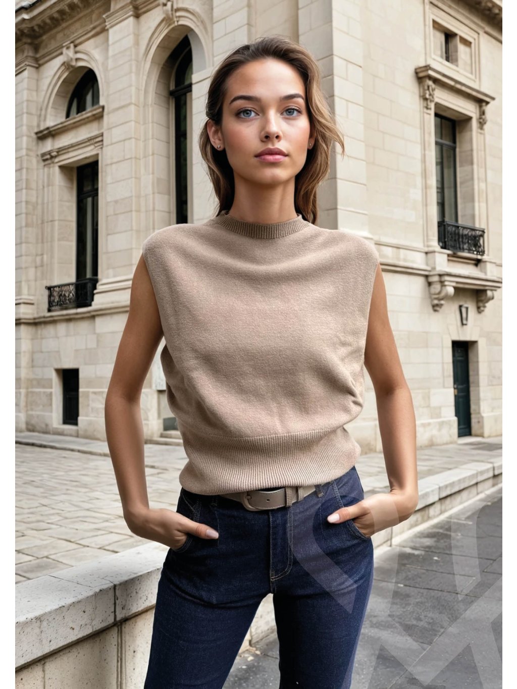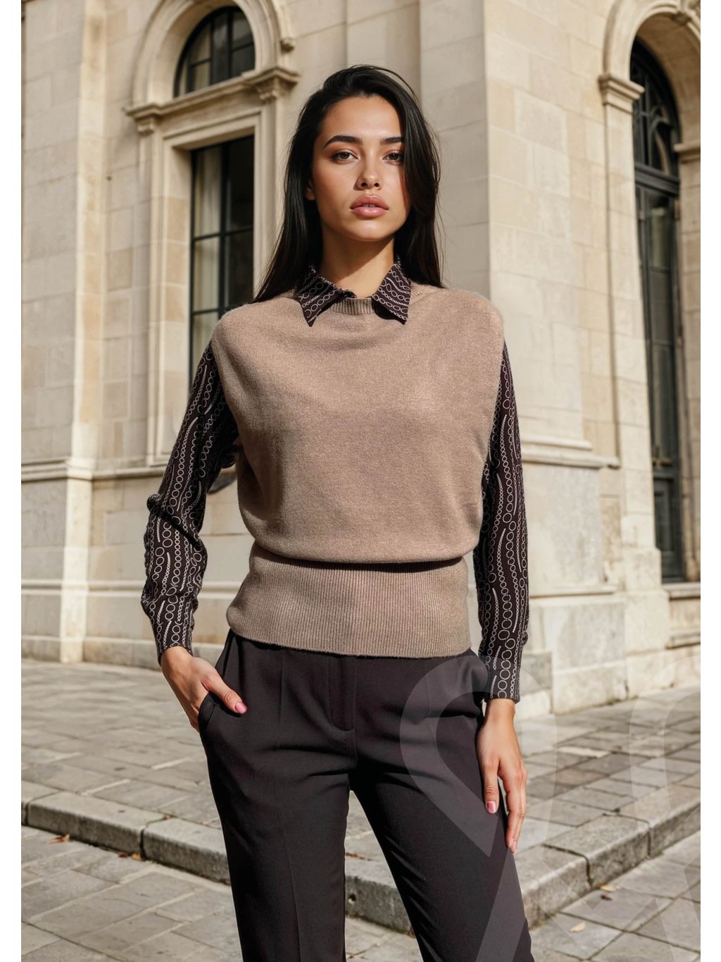 MAGENTA dámska pletená vesta v elegantnej béžovej farbe, ktorá pôsobí nadčasovo a sofistikovane. Je vyrobená z jemného, na dotyk príjemného úpletu, ktorý poskytuje pohodlie a zároveň si zachováva pekný tvar. Vesta má bezrukávový strih s mierne širšími ramenami, čo jej dodáva moderný a uvoľnený vzhľad. Golier typu stojáčik a rebríkované lemy na krku a spodnom okraji pridávajú jemné štruktúrne detaily. Strih je voľnejší, vďaka čomu sa dá ľahko kombinovať – skvelo vynikne s košeľou, rolákom alebo samostatne počas teplejších dní. Tento univerzálny kúsok je ideálny pre ležérne aj elegantné outfity, či už do práce, na stretnutie alebo voľný čas v meste.