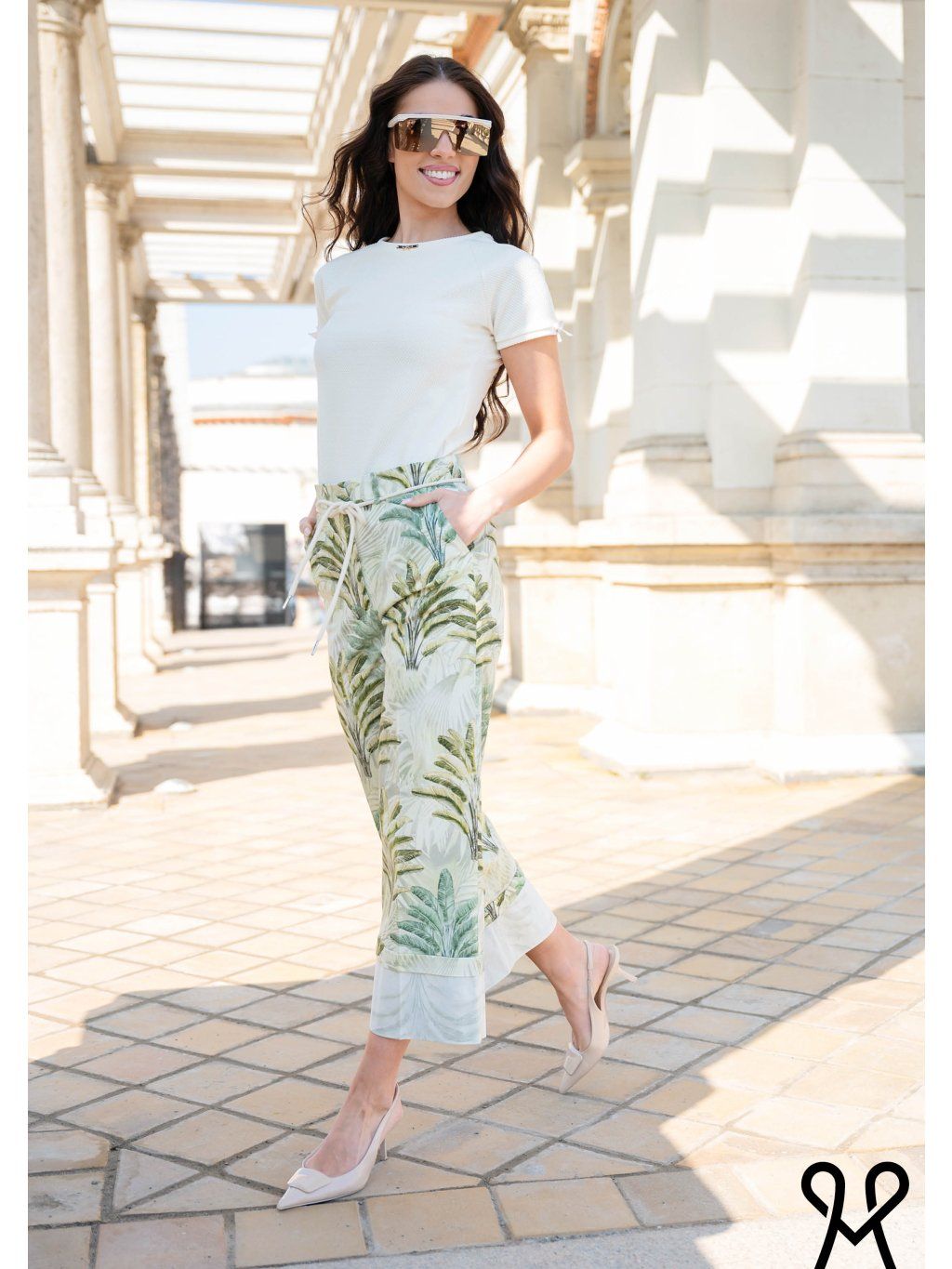 Nádherné dámske MAGENTA nohavice s jemným tropickým vzorom prinášajú svieži a moderný vzhľad do každého outfitu. Sú vyrobené z ľahkého a príjemného materiálu, ktorý zabezpečuje pohodlie počas celého dňa. Elastický pás so šnúrkou umožňuje dokonalé prispôsobenie postave, zatiaľ čo praktické vrecká zvyšujú ich funkčnosť. Voľnejší strih a skrátená dĺžka pôsobia ležérne, no zároveň elegantne. Ideálna voľba na letné dni, či už do mesta, do práce alebo na dovolenku.