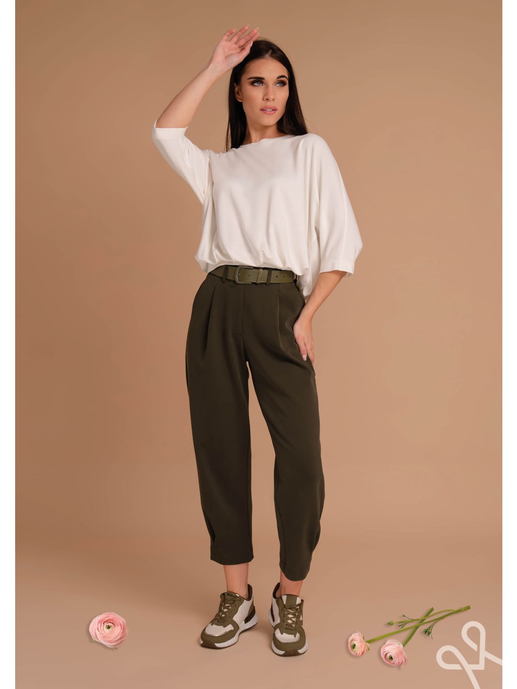 MAGENTA nohavice na majú elegantný, no zároveň uvoľnený mestský charakter. Sú v tmavozelenej, olivovej farbe a majú rovný, mierne zúžený strih smerom ku členkom s dĺžkou po lýtka. V páse sú riešené vyšším sedom, môžu bybť doplnené opaskom v rovnakej alebo v inej farebnosti, ktorý zvýrazňuje siluetu a dodáva nohaviciam upravený vzhľad. Materiál pôsobí mäkko a splývavo, vďaka čomu nohavice dobre držia tvar, no zároveň poskytujú pohodlie pri nosení. Celkovo pôsobia moderne, prakticky a ľahko kombinovateľne, vhodné na každodenné nosenie aj ležérnejšie pracovné outfity.