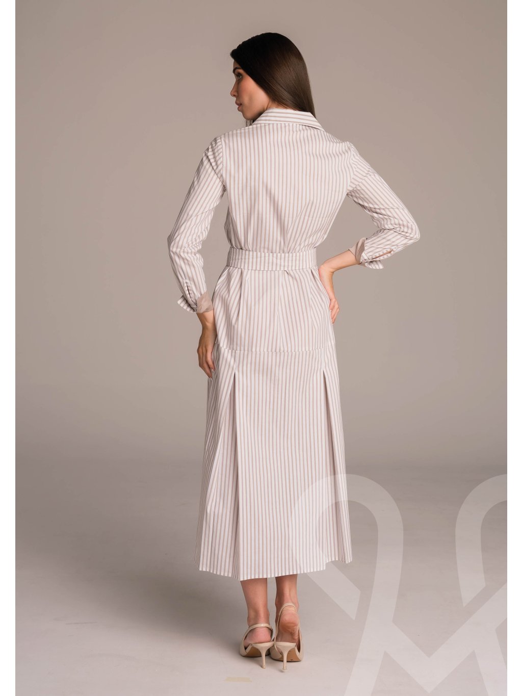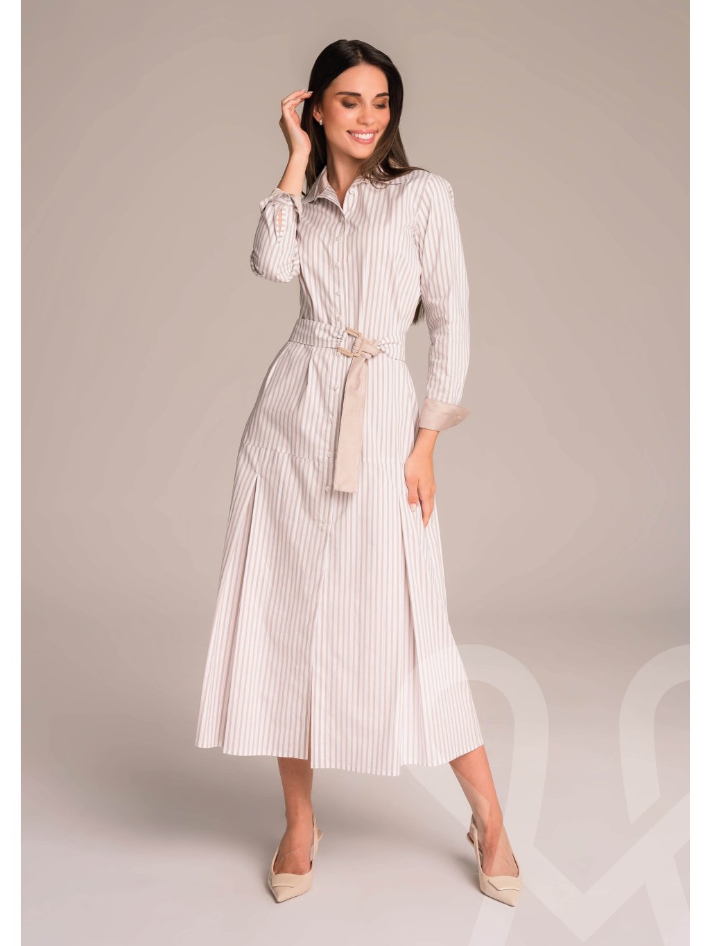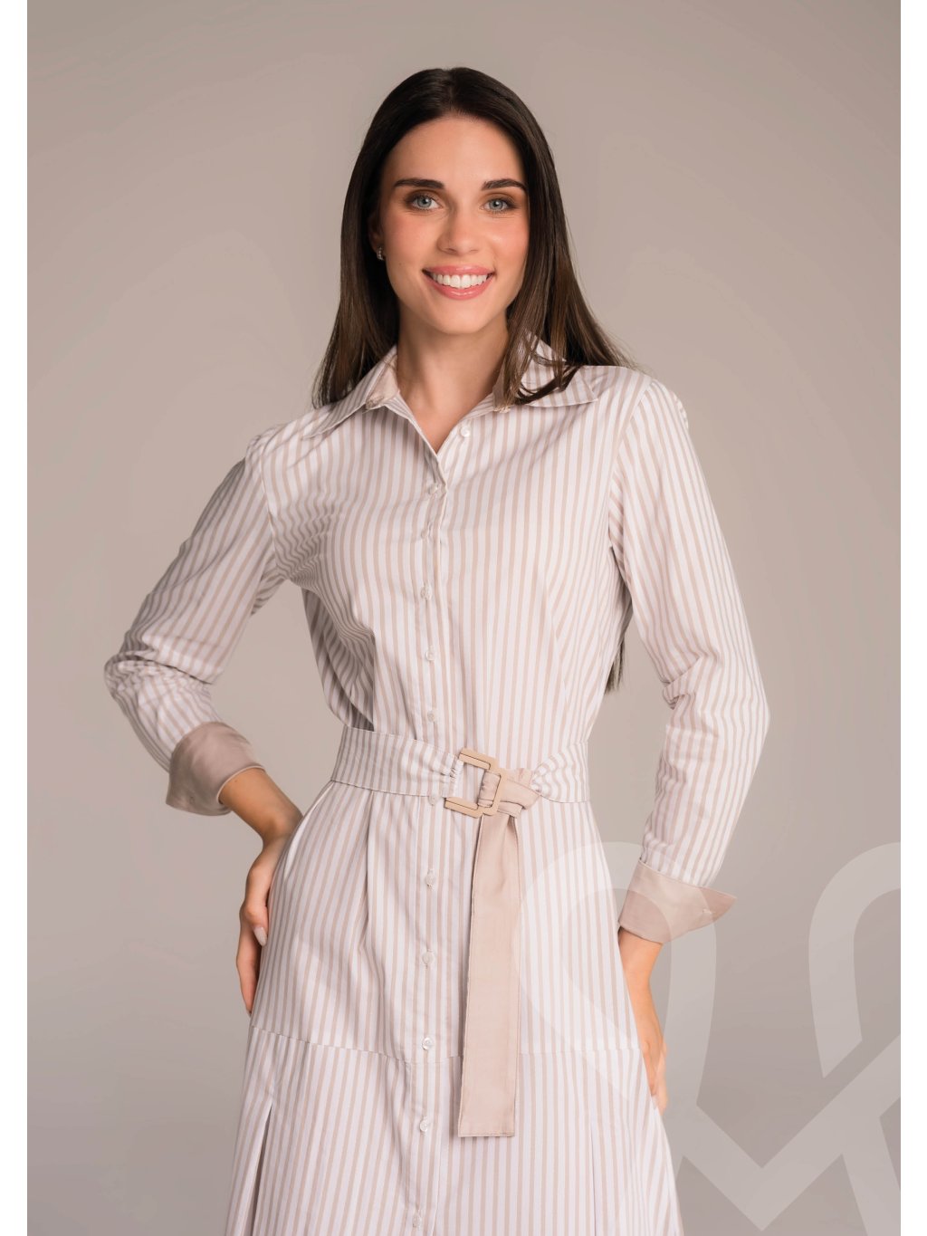 Elegantné MAGENTA šaty košeľového strihu v neutrálnych farbách s pruhovaným vzorom. Po celej dĺžke majú zapínanie na gombíky. V páse opasok v rovnakej farbe ktorý zvýraznuje siluetu postavy.Vhodné na bežné nosenie alebo spoločenské príležitosti.