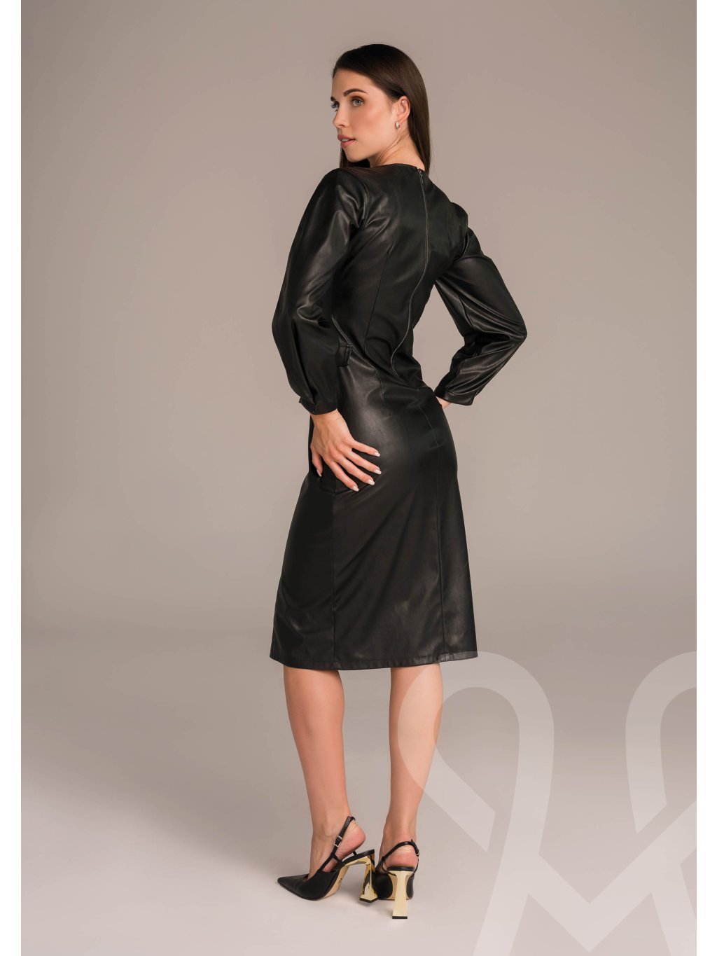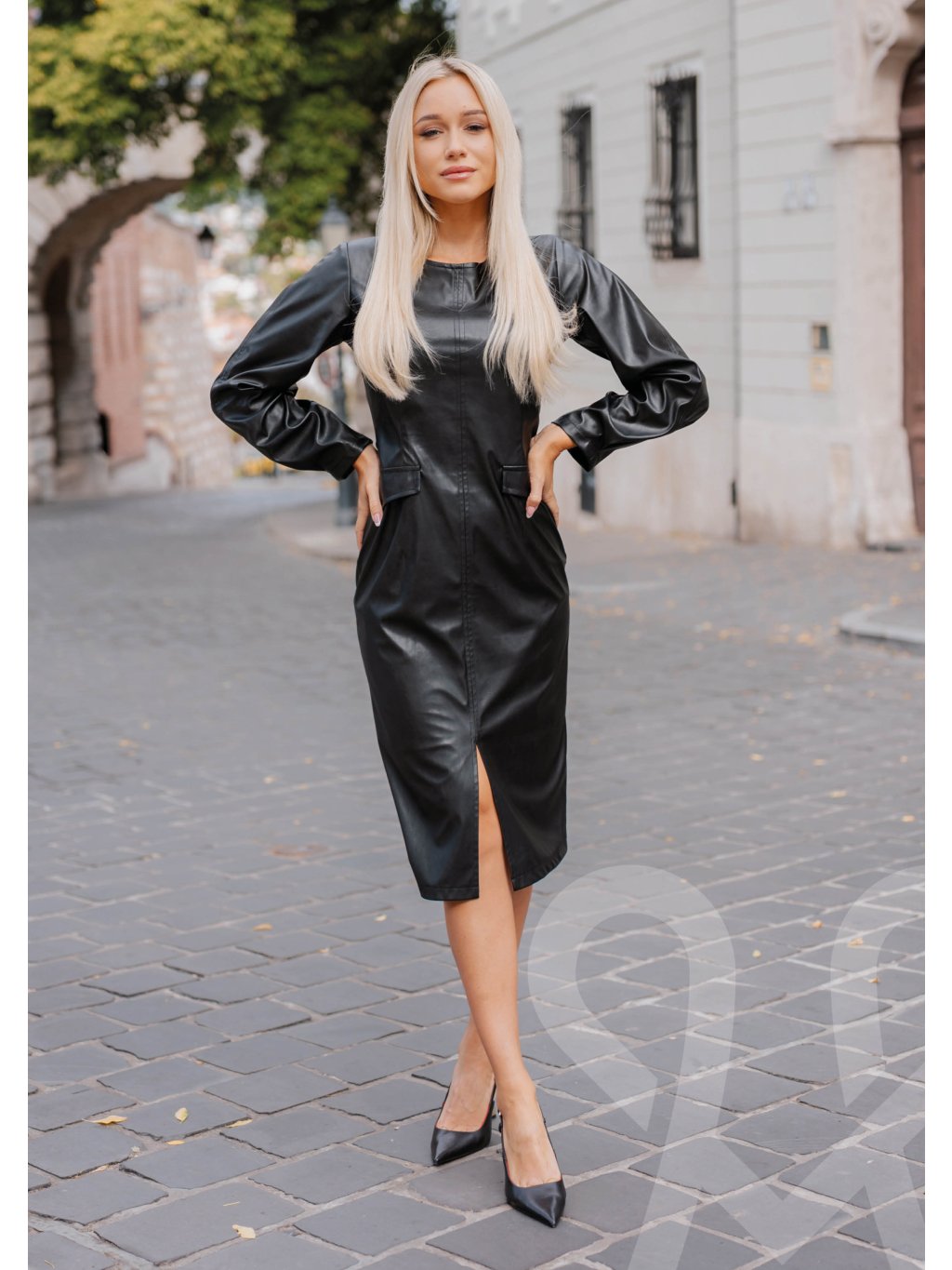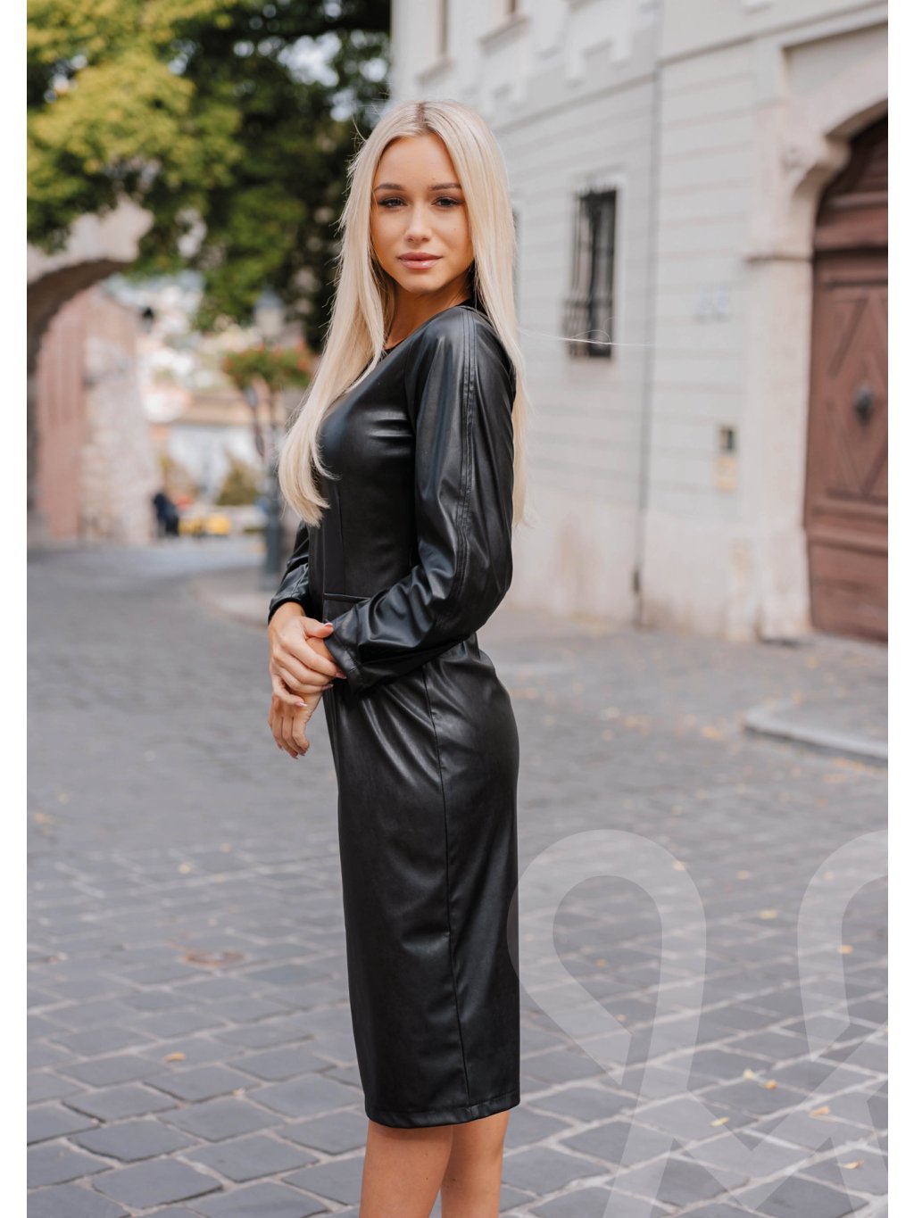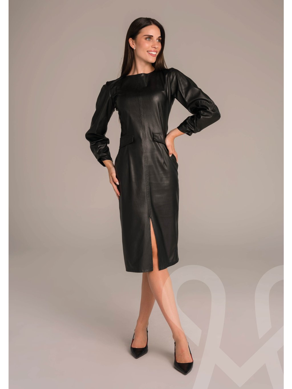 Priliehavé úzke MAGENTA dámske šaty z umelej kože po kolená s okrúhlym výstrihom, zapínaním na zips vzadu a klopami na vrecká vpredu.