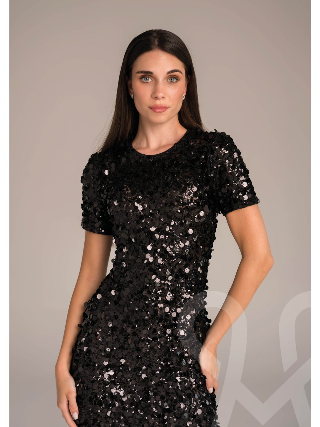 MAGENTA dámske čierne šaty s flitrami a lesklými detailami. Tvarovaný, priliehavý strih cez trup, krátke rukávy a minidĺžka nad kolená ideálne na večierky, párty, oslavy. V kombinácií s vysokými lodičkami.