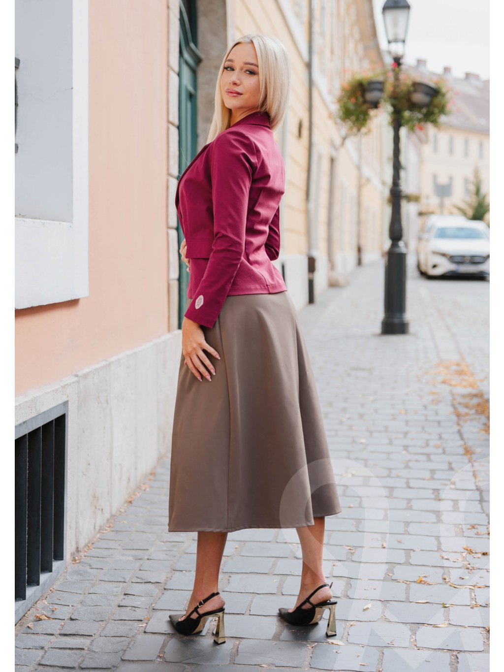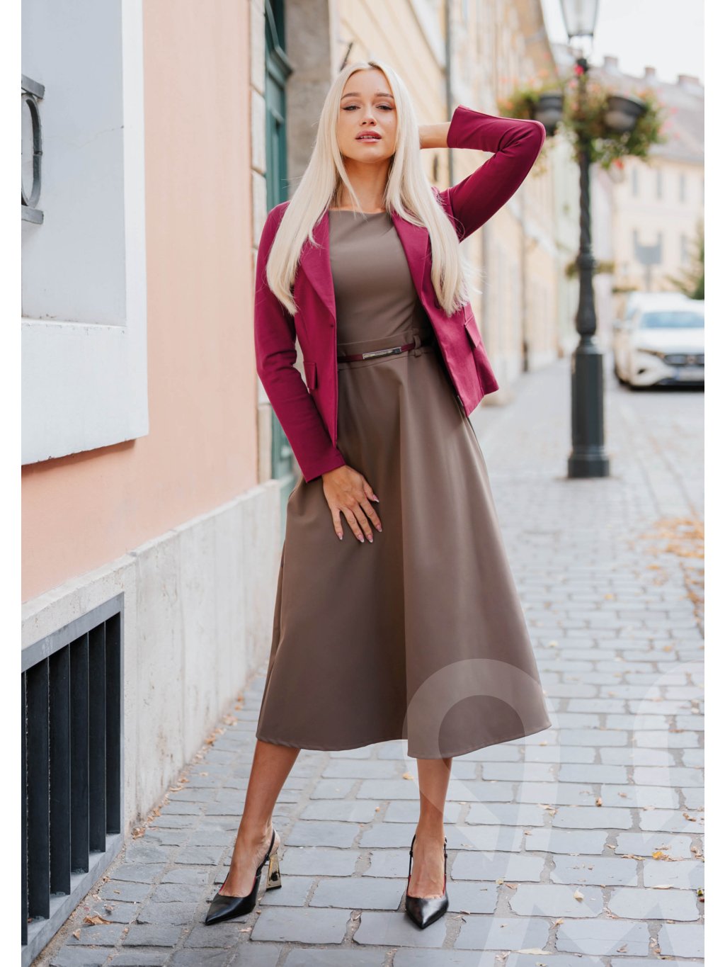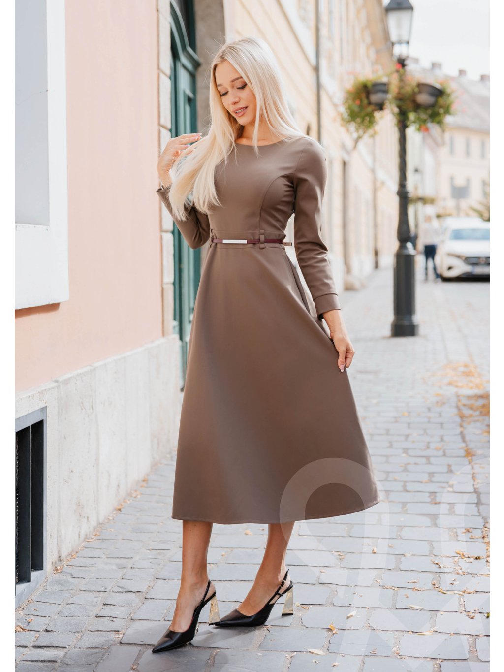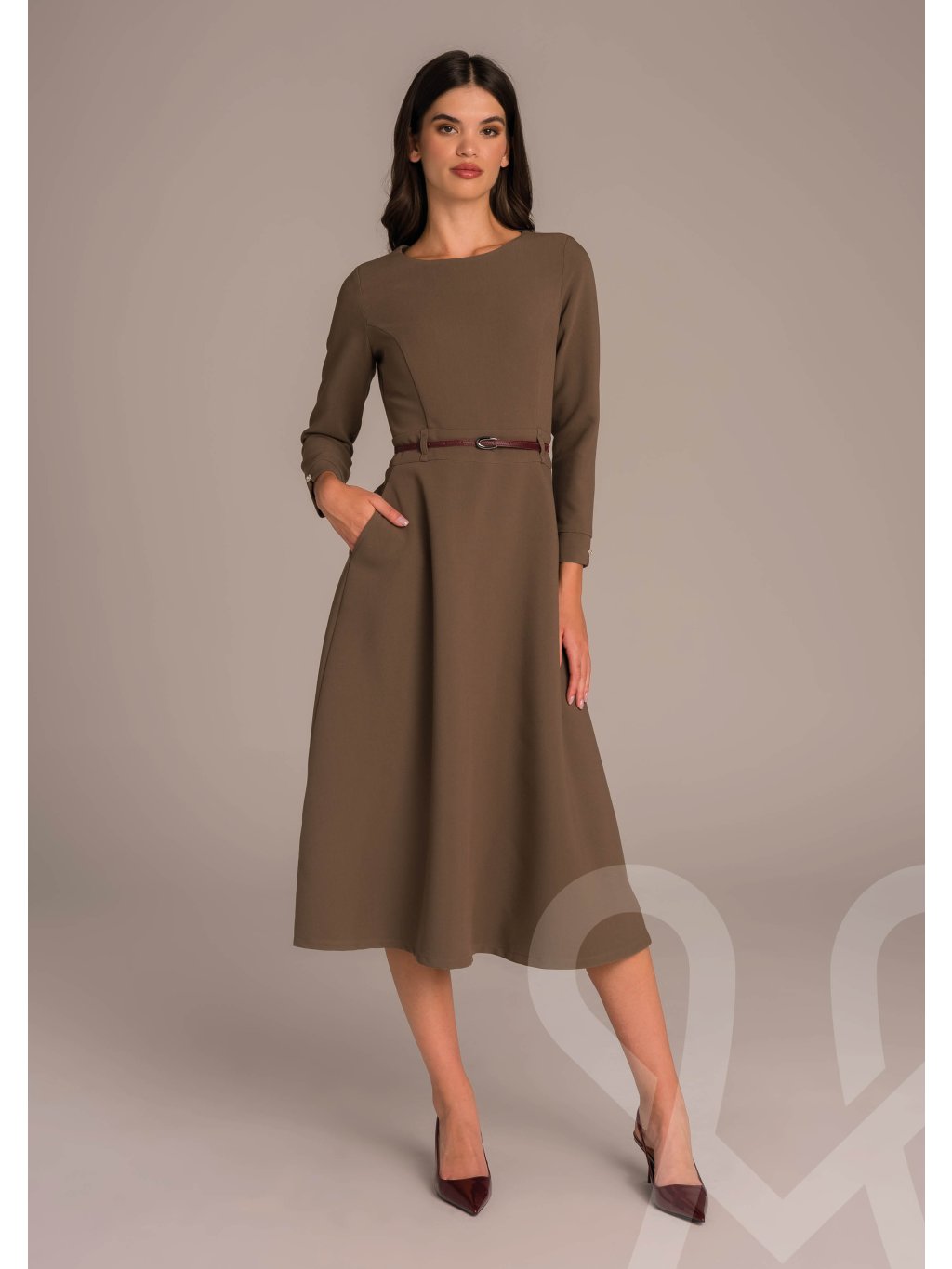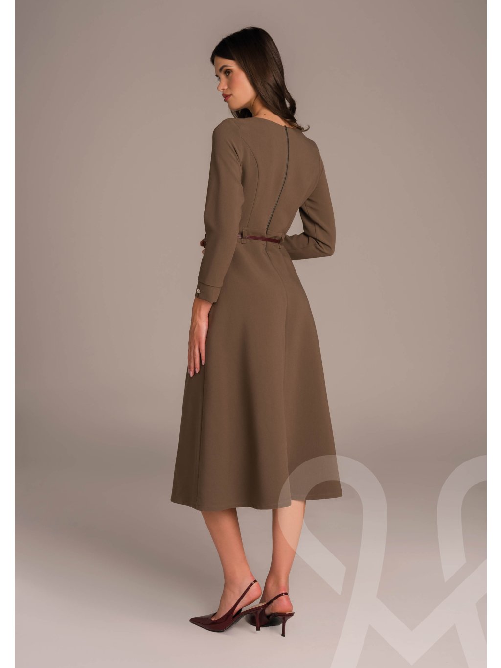 MAGENTA elegantné šaty sú dámske midi šaty v olivovo-hnedej farbe s jednoduchým a elegantným strihom. Majú dlhé rukávy, okrúhly výstrih a jemne rozšírenú sukňu v dĺžke pod kolená, čo im dodáva ženský a sofistikovaný vzhľad. V páse sú zvýraznené tenkým bordovým opaskom, ktorý opticky zoštíhľuje siluetu a pridáva kontrastný detail.