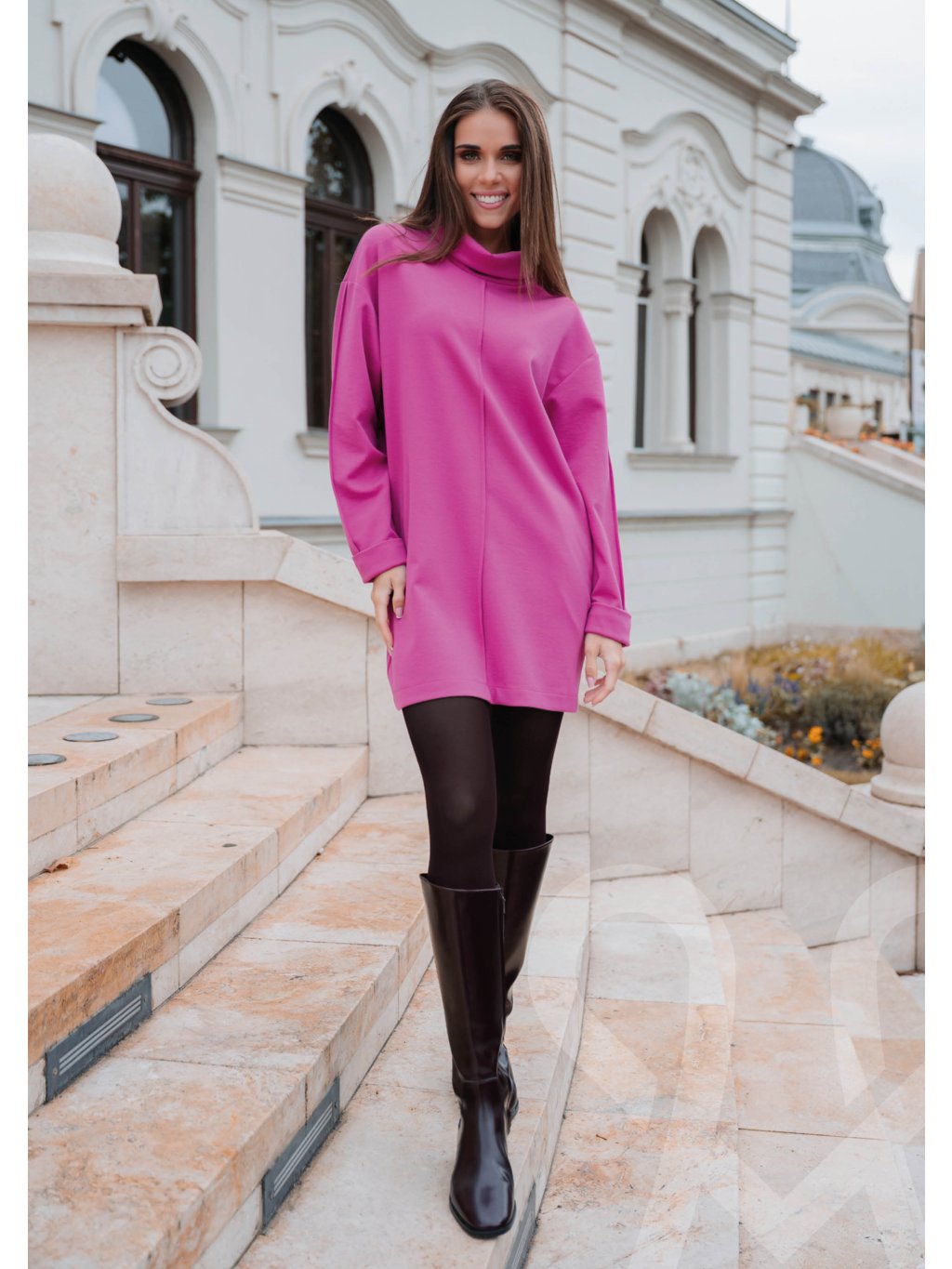 MAGENTA šaty–tunika v energickom odtieni fuchsie sú stvorením pre dni, keď chcete vyniknúť bez námahy. Voľný, pohodlný strih pôsobí trendy a zároveň lichotí postave, zatiaľ čo mäkký materiál zaručuje príjemné nosenie počas celého dňa. Širší stojáčik dodáva modelu šmrnc a moderný charakter. V kombinácii s čižmami a pančuchami vytvárajú štýlový mestský outfit, ktorý je ideálny na jesenné aj zimné prechádzky. Jednoduchý, no výrazný kúsok, ktorý rozžiari každý šatník.