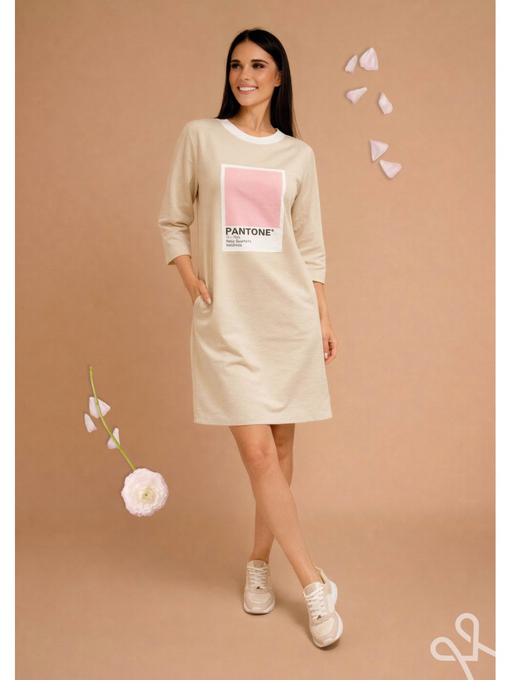 MAGENTA šaty na obrázku majú jednoduchý, moderný a ležérny vzhľad. Sú ušité v jemnej krémovo-béžovej farbe a majú rovný, mierne voľný strih po kolená, ktorý pôsobí pohodlne a nenútene. Rukávy sú trojštvrťovej dĺžky a výstrih je okrúhly, zvýraznený kontrastným bielym lemovaním. Dominantným prvkom je grafická potlač na prednej strane v štýle Pantone, tvorená svetloružovým obdĺžnikom s nápisom, ktorá dodáva šatám moderný a dizajnový charakter. Praktickým detailom je bočné vrecko, vďaka ktorému sú šaty nielen štýlové, ale aj funkčné. Celkovo pôsobia veľmi čisto, minimalisticky a sú vhodné na každodenné nosenie.