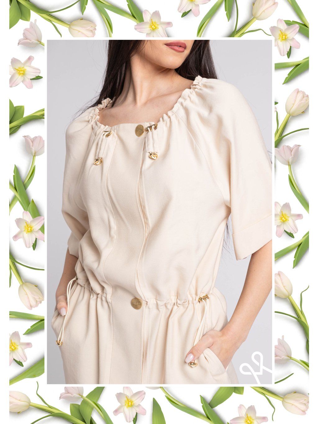 Krátke, voľné rukávy a ľahký materiál zabezpečujú maximálne pohodlie počas nosenia. Praktické vrecká a výrazné zlaté gombíky dodávajú šatám luxusný nádych. Tento model je ideálny na kombinovanie s elegantnou obuvou aj ležérnymi doplnkami.