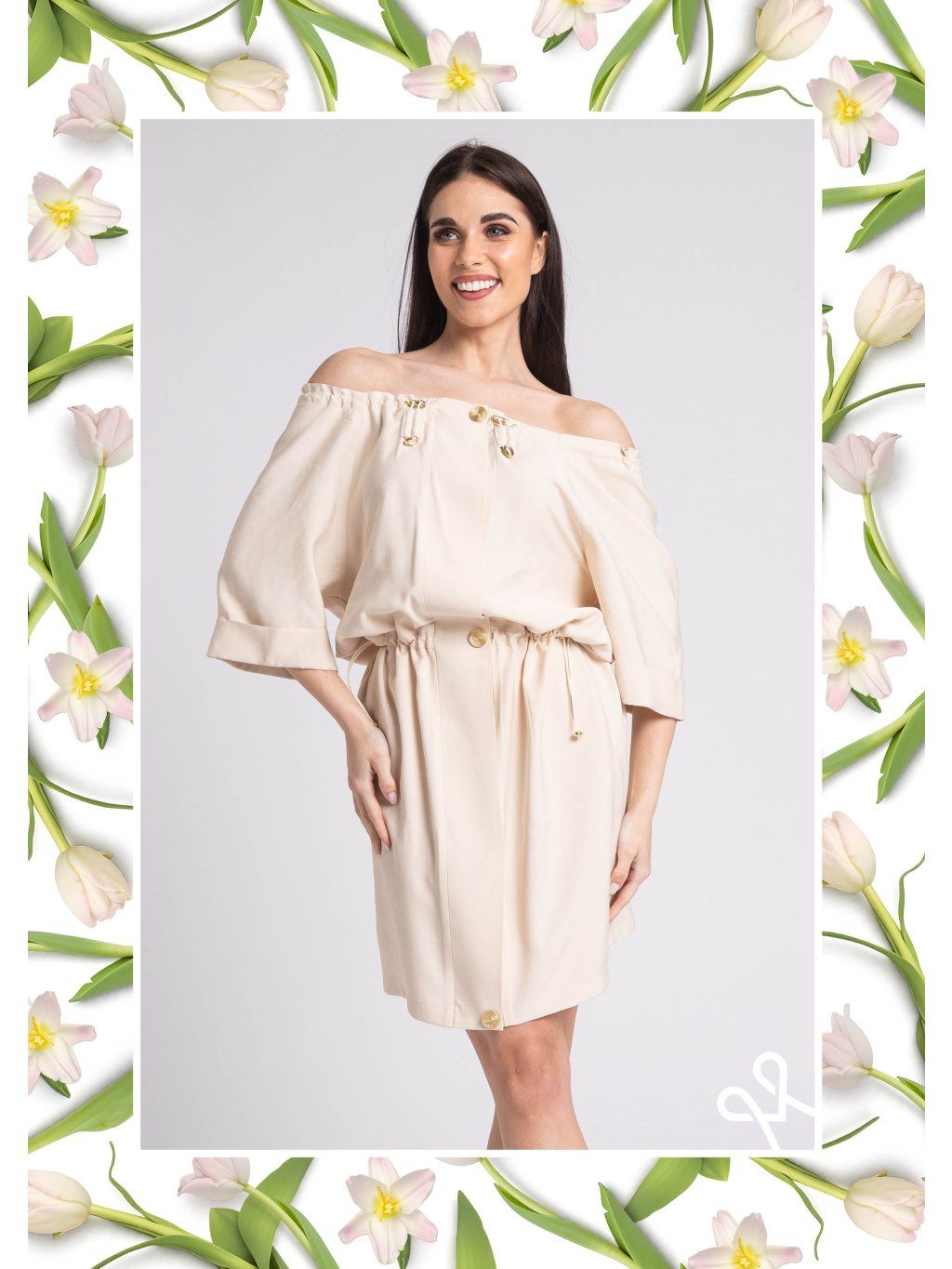 Voľnejší strih s odhalenými ramenami dodáva šatám moderný a jemne zvodný vzhľad. Elastický výstrih je doplnený o ozdobné šnúrky so zlatými detailmi, ktoré vytvárajú zaujímavý dizajnový prvok. V páse sa nachádza sťahovanie, ktoré umožňuje prispôsobiť si siluetu a zároveň zvýrazní ženské krivky.