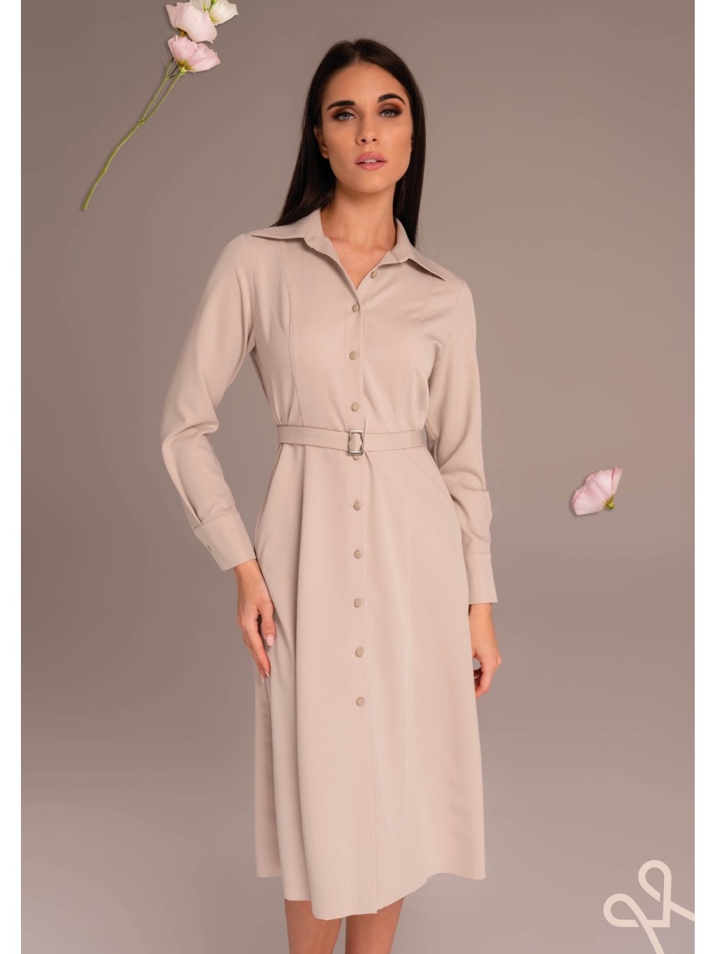 Tieto MAGENTA elegantné, minimalistické šaty v jemnom béžovom až púdrovom odtieni. Majú košeľový strih s klasickým golierom a zapínaním na drobné gombíky po celej dĺžke predného dielu. Dlhé rukávy sú zakončené manžetami, čo šatám dodáva uhladený a nadčasový vzhľad. V páse sú jemne zúžené a zvýraznené úzkym opaskom s kovovou prackou, vďaka čomu pekne formujú siluetu. Sukňová časť je mierne rozšírená a splývavá, s dĺžkou približne po kolená, čo pôsobí žensky a zároveň veľmi decentne. Celkový dojem je čistý, sofistikovaný a univerzálny – šaty sa hodia na formálnejšie príležitosti aj na elegantné denné nosenie.